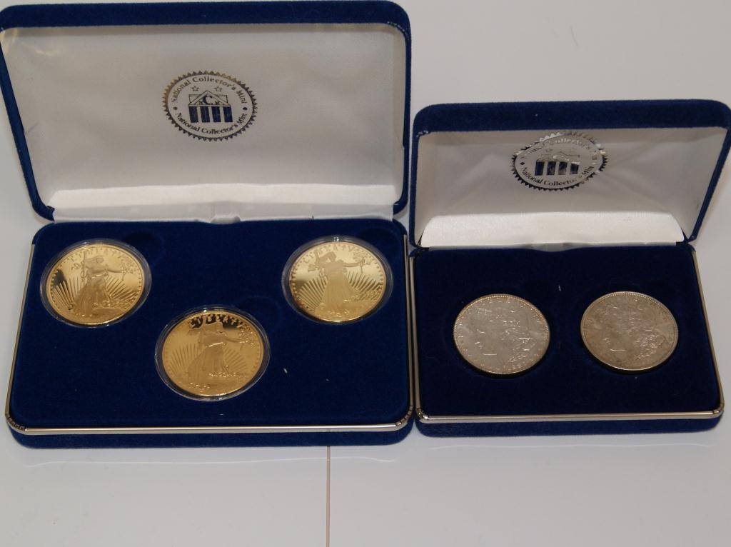 Times the money A) The First set contains Two Gold Plated Double Eagles that each have one ounce of silver and one gold platedDouble Eagle that is not silver B) The Second Set has two Uncirculated Dollars The first dollar is an 1887 Morgan Dollar, the second is an 1921 Morgan Dollar