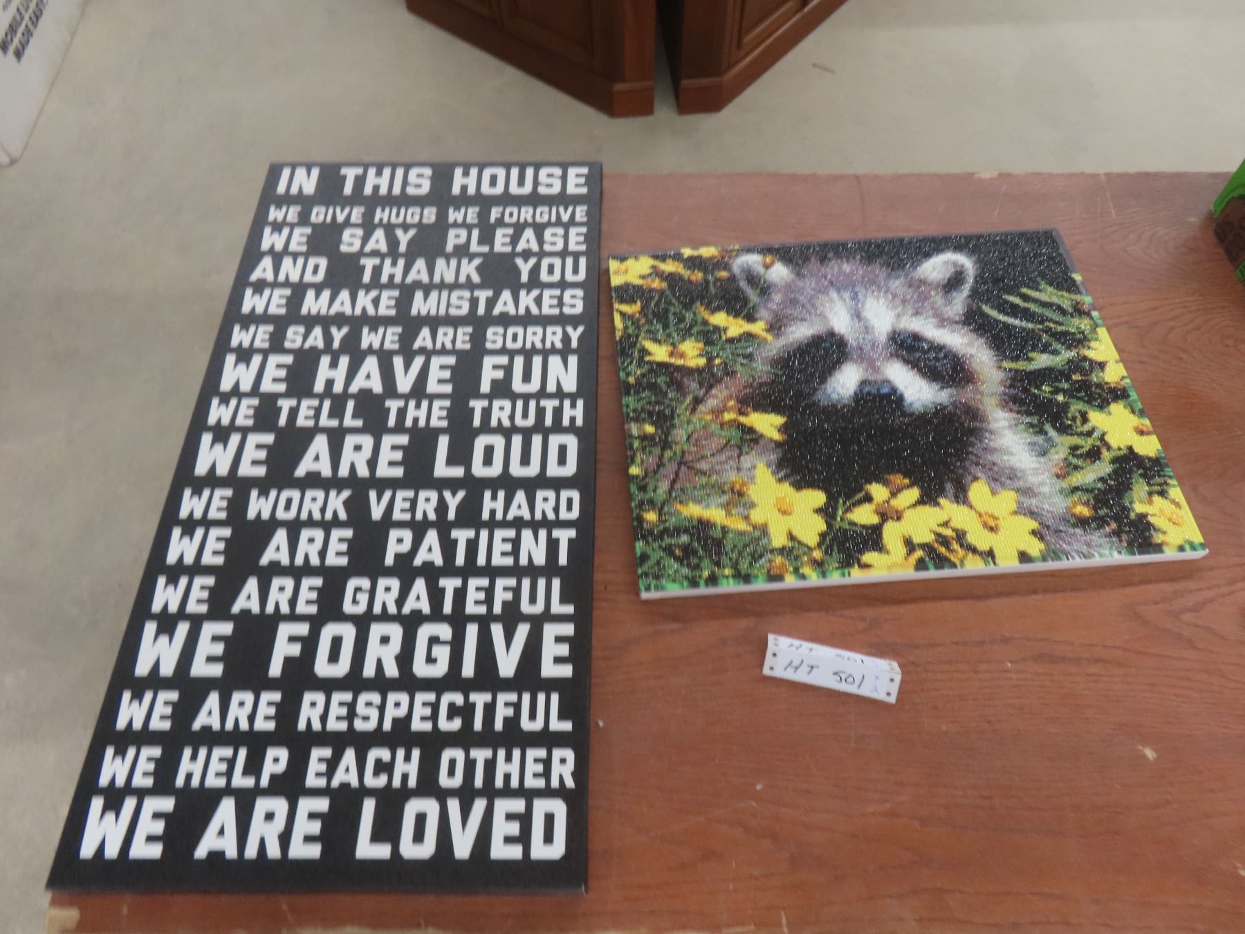 Two Wall Art Pieces: Slogan 30" x 15" and 16" x 20" Cute Raccoon