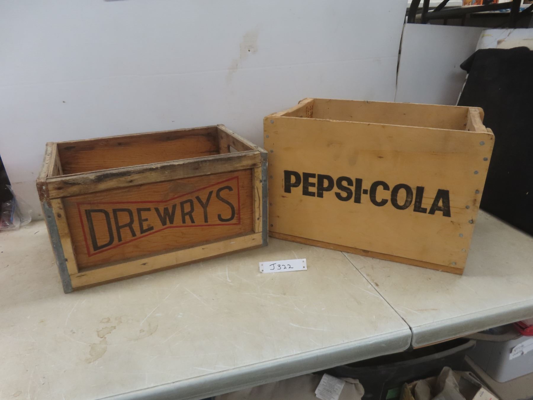 Two Wood Crates: Drewrys (10" x 18" x 13") and Pepsi-Cola (12" x 18" x 12")