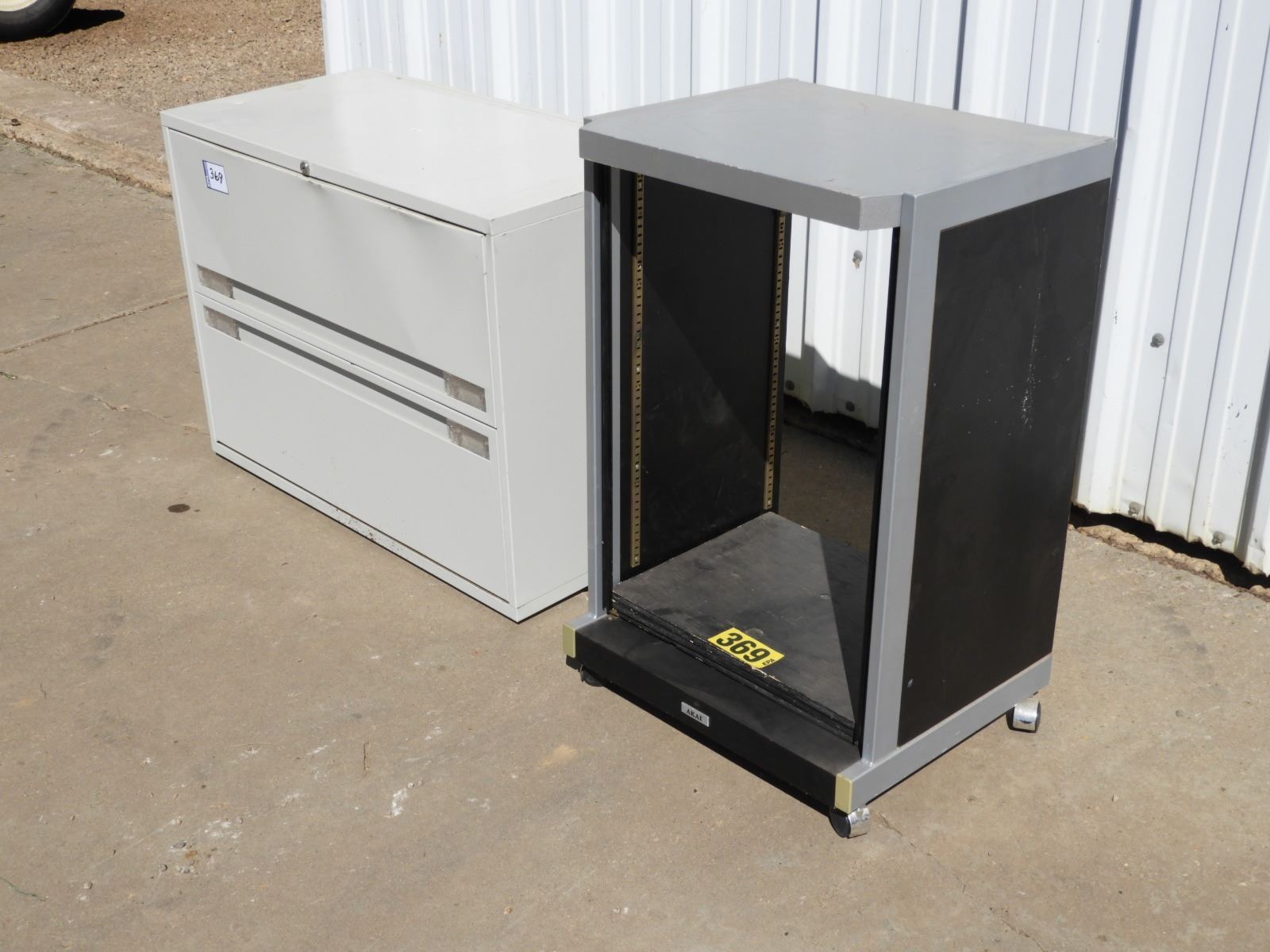 Two drawer metal file cabinet 36"Lx 27"Hx 18"Deep, Four drawer wood dresser 30"Wx38"Hx16"deep, Four shelf stereo cabinet 121 1/2"Wx 34"Hx 18"deep