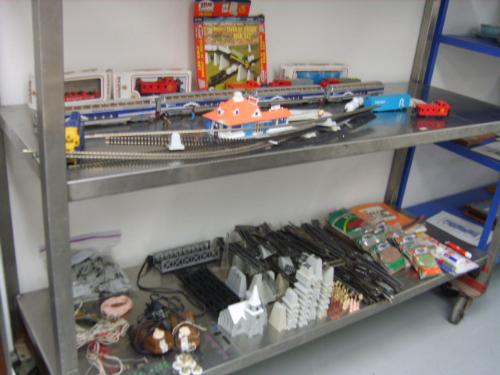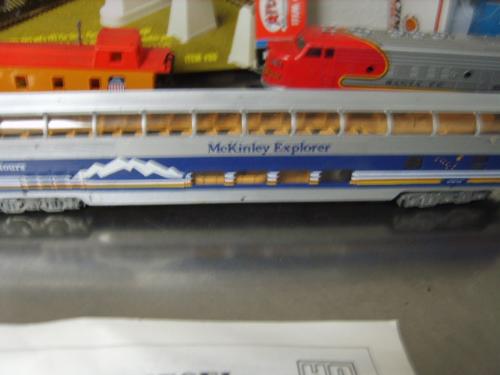 Two shelves of train tracks and train, McKinley explorer train, and Alaska railroad engine (2)