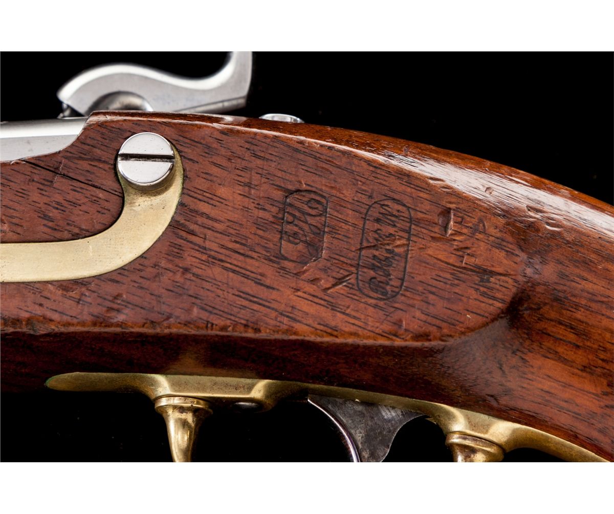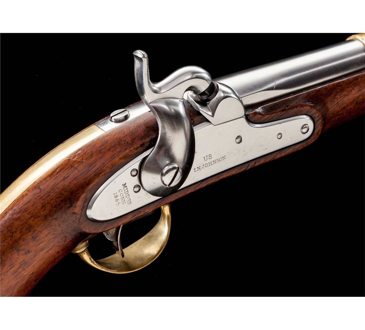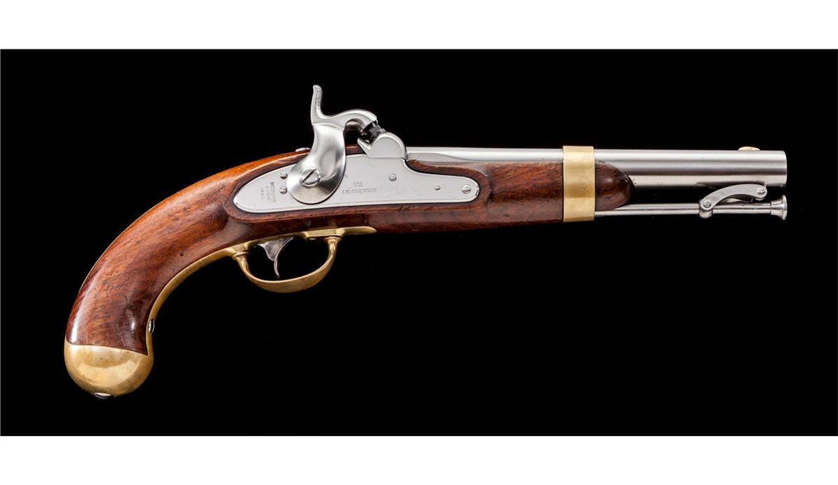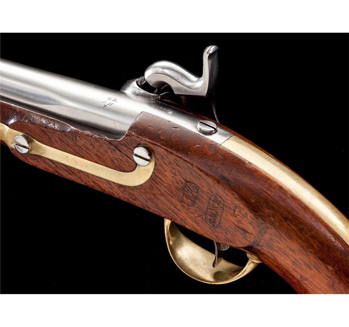 U.S. Model 1842 Percussion Pistol, by Johnson, .54 cal., 8-1/2'' barrel, brass band, triggerguard, pommel, and front sight blade, cartouched walnut stock. Sideplate marked ''U.S./I.N. Johnson'' and ''Midd TN/Conn/1855''. Barrel tang is similarly dated 1855, and top of barrel opposite percussion bolster ''U.S./JH/P''. Condition is excellent as cleaned. All iron surfaces are bright. Brass with only the lightest patination. Stock with minor scuffs and small inclusion emanating from area near top sideplate screw. Good functioning action, nipple appears new and unused, bore is bright. Est.: $1,200-$1,800. (Antique)