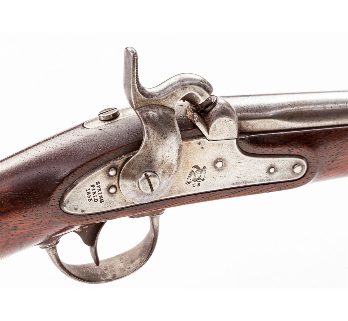 U.S. Model 1847 Artillery Musketoon, by Springfield Armory, lock dated 1855, .69 cal. smoothbore, 26'' barrel finished bright (barrel tang dated 1847), walnut stock, trumpet-shaped iron ramrod, full-length walnut stock, sling swivel on lower barrel band and on toe of butt. Brass front sight blade. U.S. markings on upper tang of buttplate. Considered quite scarce with only approx. 3360 mfg'd from 1848-1859. Condition is about fine with light scuffs and scratches to metal surfaces and very minor toning. Barrel band retainers show 97% blue. Stock with clear cartouche. Action is good, bore has toned but should clean somewhat. Est.: $2,500-$3,500. (Antique)