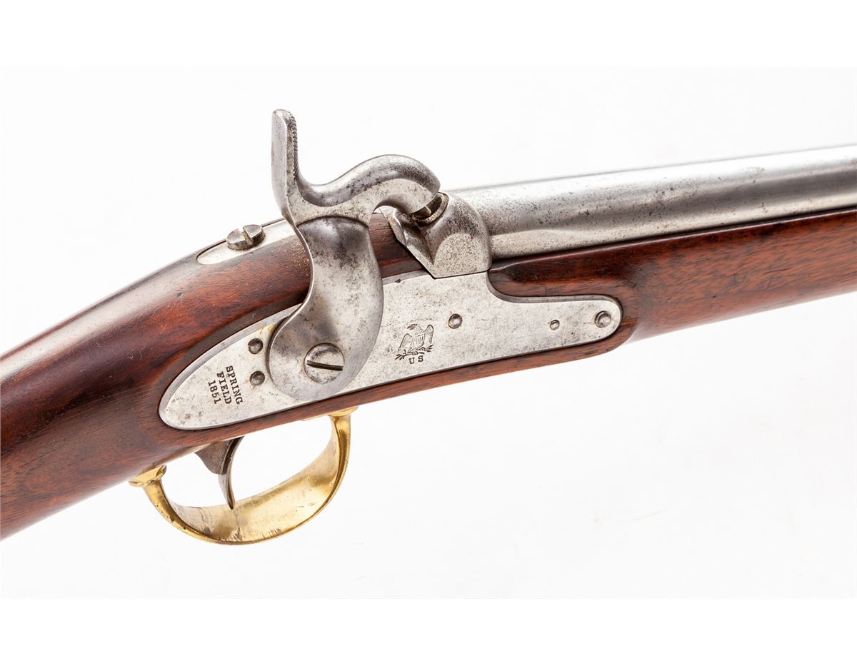 U.S. Model 1847 Percussion Cavalry Musketoon, by Springfield, 1851 dated lockplate and barrel tang, .69 cal., 26'' barrel, brass bands, buttplate, and triggerguard; ramrod swivels have been removed, as have the saddlering and bar; nicely cartouched walnut full stock with ''JH'' initials just behind triggerguard. Condition is fine as lightly cleaned and modified, barrel metal being burnished with scattered pitting near nipple bolster. Stock with scuffs and scratches and small fissures near butt which detract little. Action is good, bore with moderate toning, much of which should clean. Est.: $1,200-$1,800. (Antique)