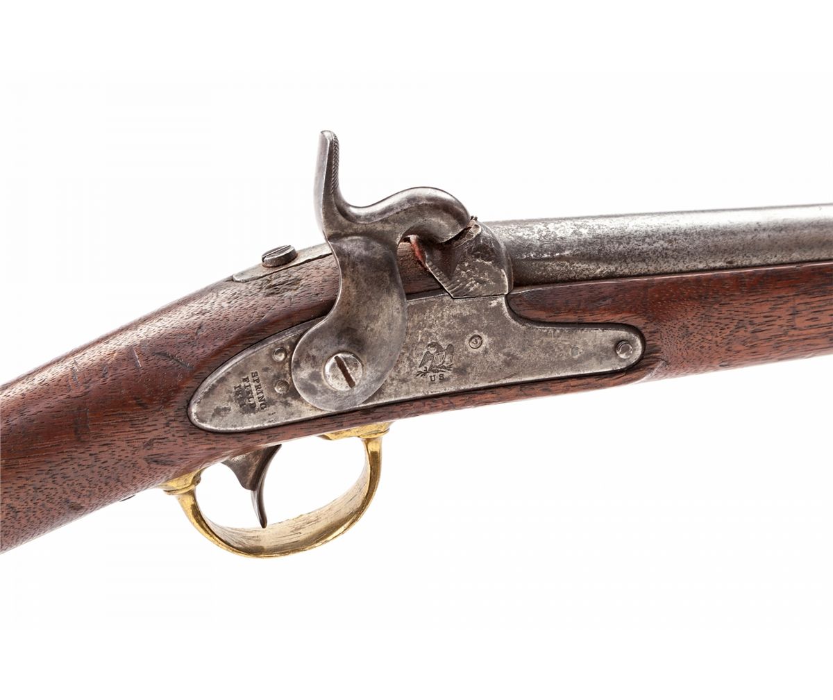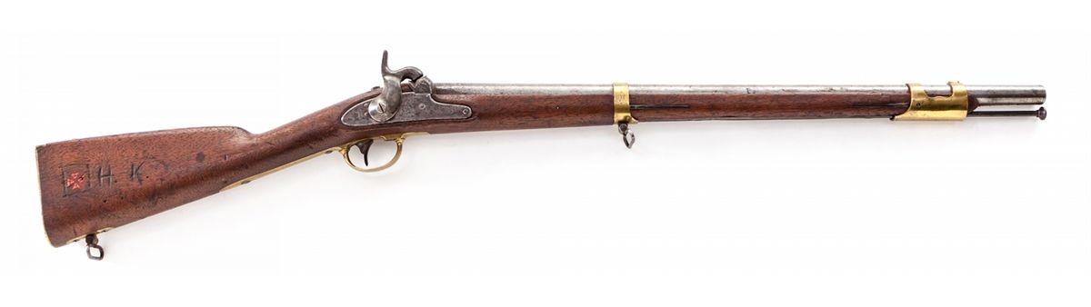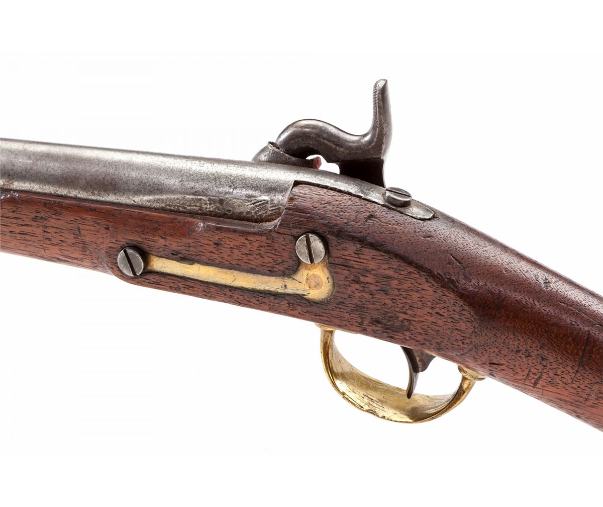 U.S. Model 1847 Percussion Cavalry Musketoon, by Springfield, 1851 dated lockplate, .69 cal., 26'' barrel, brass bands, buttplate, and triggerguard; ramrod swivels have been removed, as have the saddlering and bar; faintly cartouched walnut full stock with initials just behind triggerguard. Condition is fine as lightly cleaned and modified, barrel metal being burnished with scattered pitting near nipple bolster. (Nipple tip has broken off.) Stock with scuffs and scratches, trooper's initials and Maltese cross in red to right cheekpiece area. Brass and iron sling swivels have been added to rear barrel band and heel of stock. Action is good, bore with light frosting. Est.: $1,200-$1,800. (Antique)