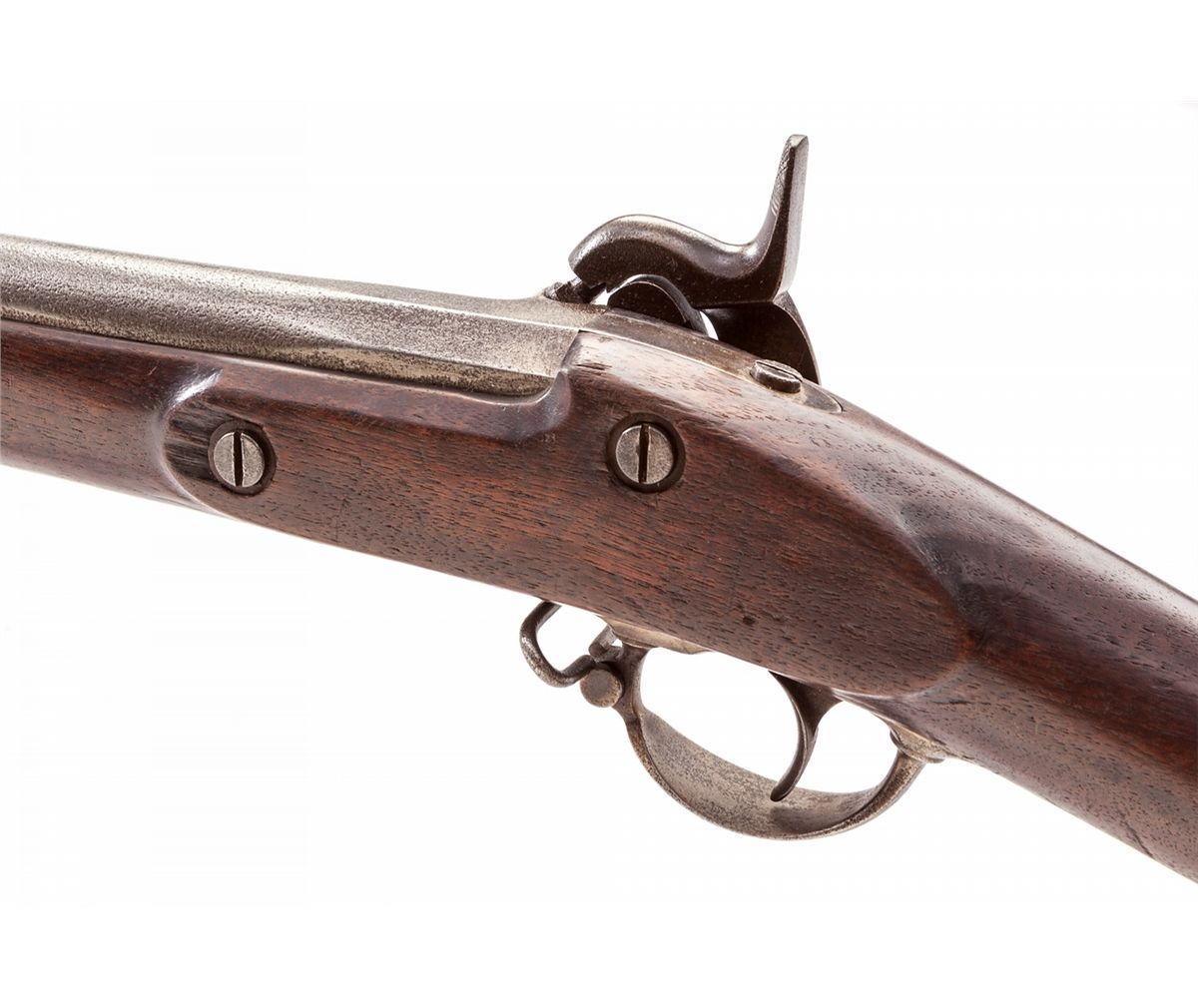 U.S. Model 1855 Short Percussion Rifle, by Springfield, .58 cal., 31'' barrel, iron hardware and brass forend tip, two barrel bands, featuring Maynard tape priming compartment, 1858 dated lock, with long-range type rear sight. Mfg'd without patchbox. Condition is good to very good with moderate overall cleaned pitting. Good functioning primer feed and action. Stock with light wear and small loss to forward lock screw on left side. Bugle-tip ramrod is present. Est.: $1,800-$2,400. (Antique)
