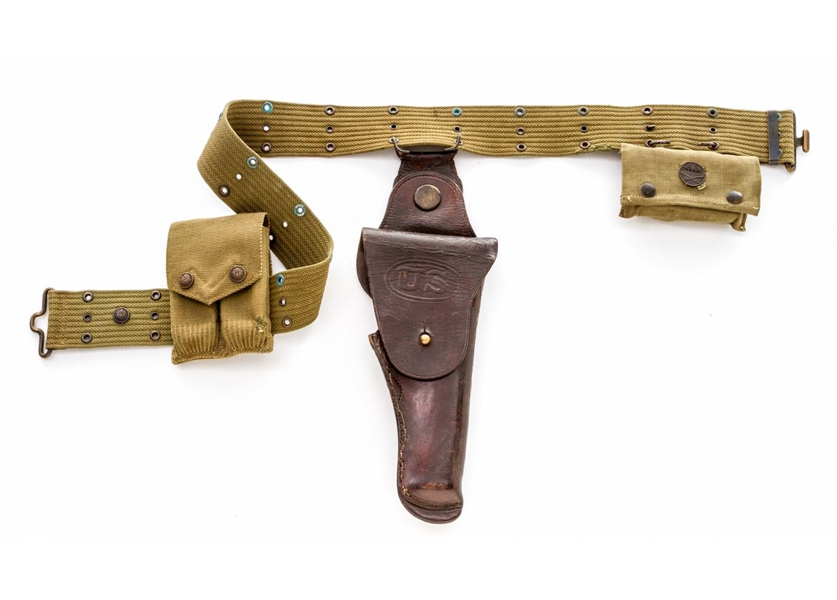 U.S. Model 1912 Pistol Rig, with RIA 1912 dated Model of 1912 holster, green canvas 1st Model 1st aid pouch with 11th Cavalry brass insignia to flap; Bauer & Black 1916 dated U.S. Army 1st aid kit, both belt and two-cell mag pouch by Mills, both with rimmed eagle snaps. Condition is excellent. Holster with arsenal repair stitching, crazing to rear portion, and thinning to leather near suspension area. Some verdigris to brass eyelets on belt. Pistol belt with additional repair to bottom edge near 1st aid kit. Est.: $500-$750/lot.