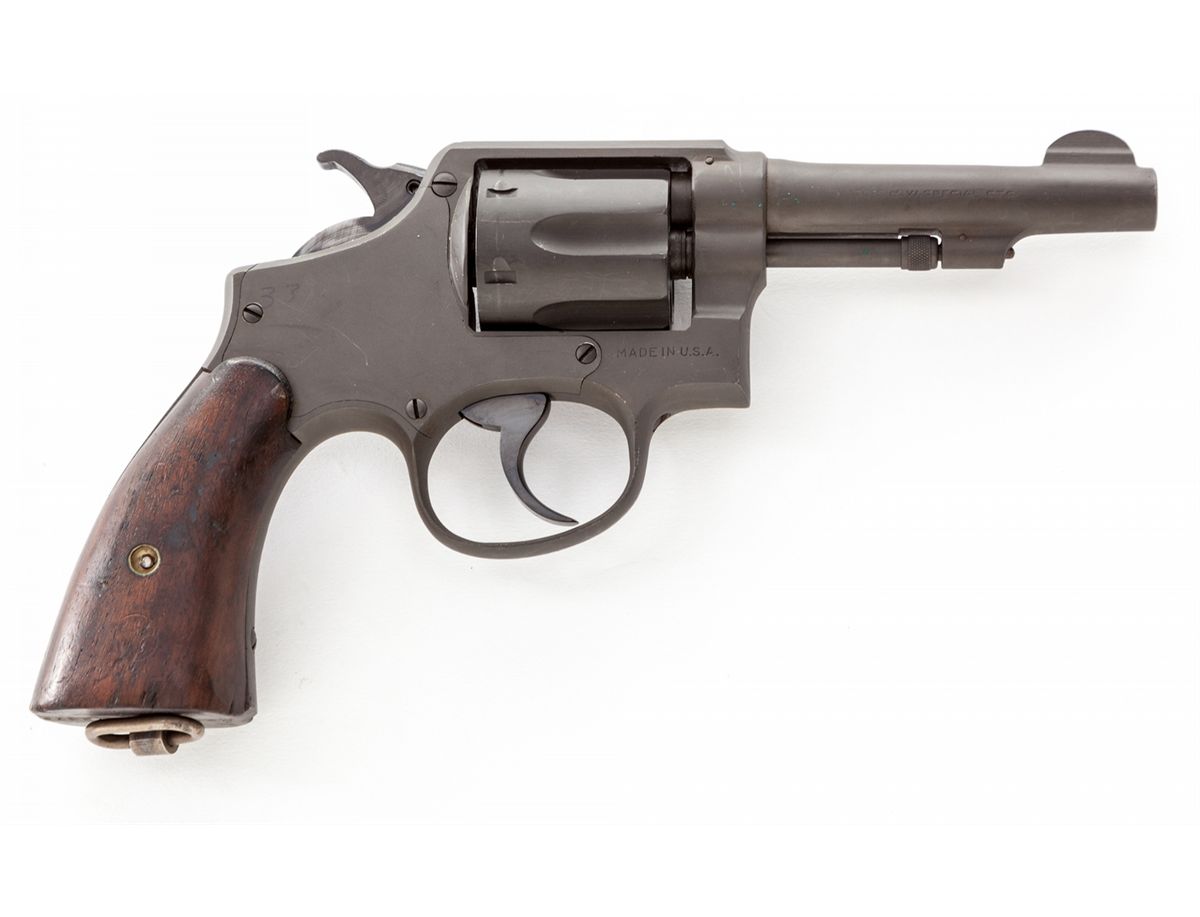 U.S. Navy marked Smith & Wesson Victory Model Double Action Revolver, with rigger made brown leather shoulder holster marked ''Mfg by A&R Dep't/NAS Norfolk, VA'', #V173378, .38 Spec. cal., 4'' barrel, parkerized finish, blue hammer and trigger, smooth walnut grips with DOD eagle cartouches to both sides. Area below cylinder latch marked ''U.S. Navy/Property''. Butt of revolver with flaming bomb and ''GHD'' inspector mark. Front of holster is marked ''U.S. Navy'' embossed in gold. Condition is excellent showing just light handling marks. Grips with scuffs, scratches, minor oil staining. Action is good and crisp, bore is mirror bright blue. Holster with some darkening from age and light verdigris near metal components. Est.: $1,200-$1,800. (C&R)