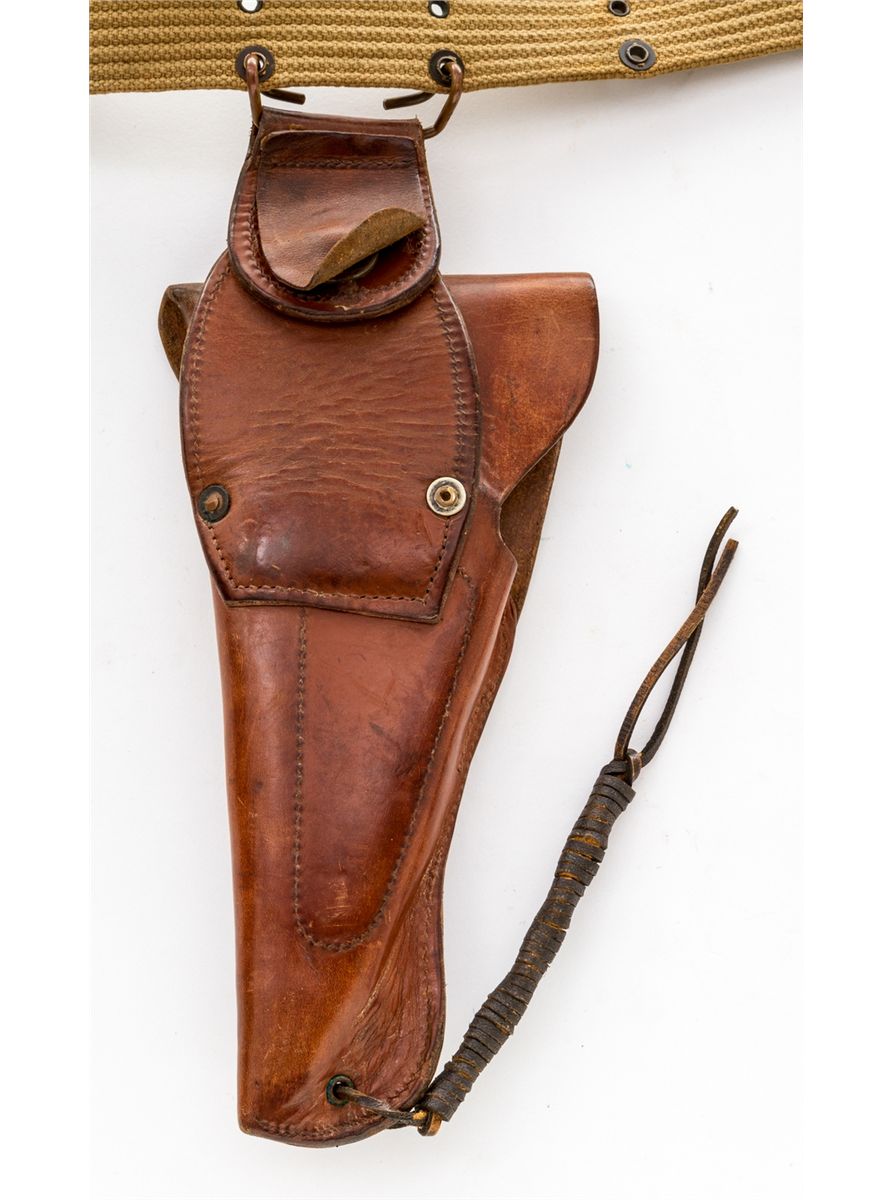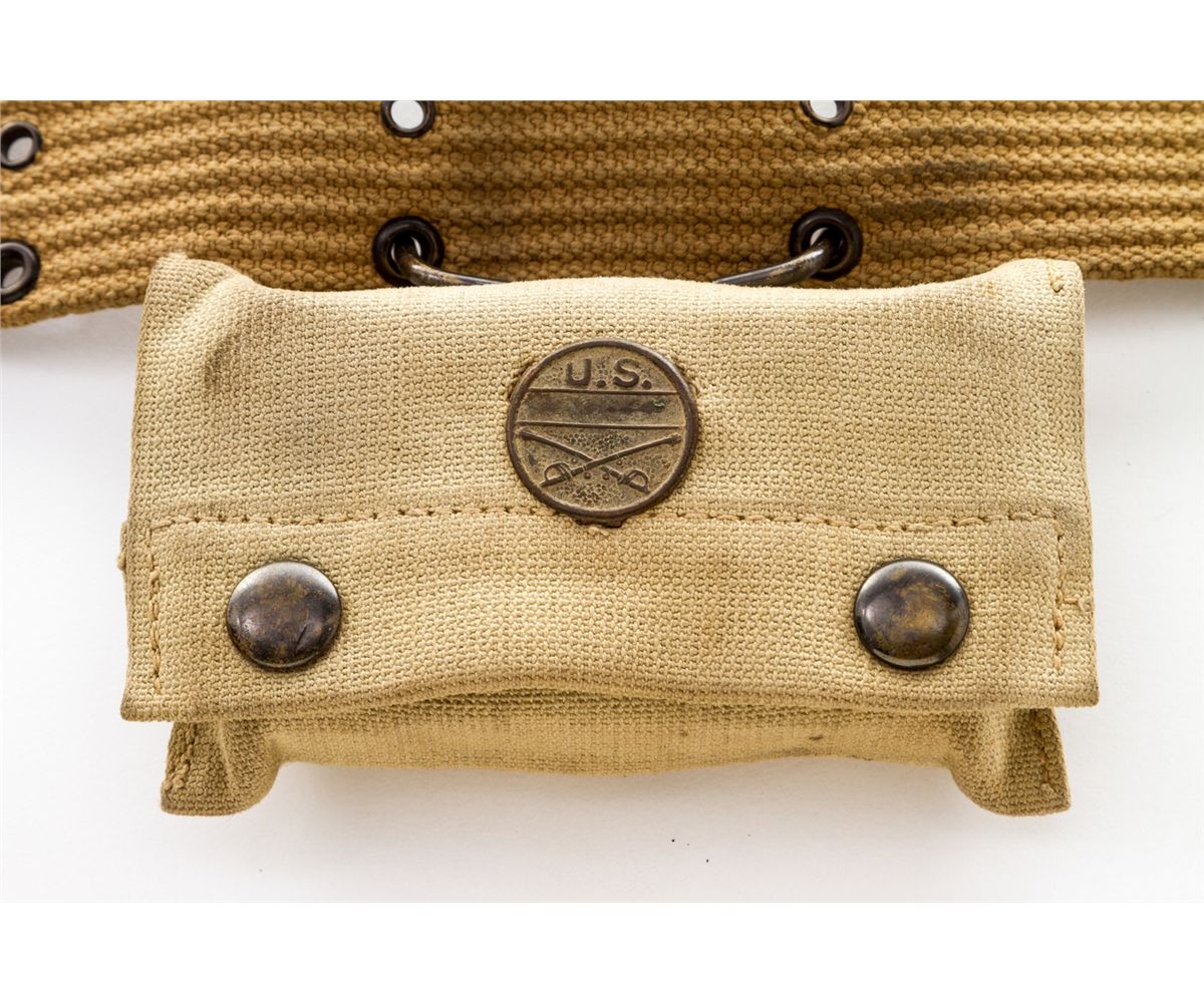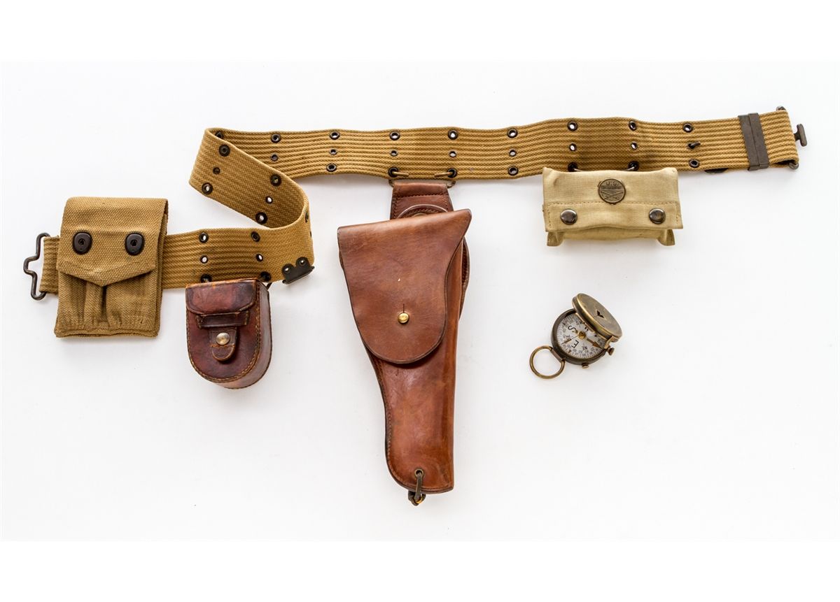 U.S. Officer's Pistol Belt, Holster, 1st Aid Kit, Mag Pouch, Leather Compass Pouch, and Engineer's Compass. A late Model 1912 rig dating from 1918, with private purchase brown russet unmarked 1912 holster with leather thong; pistol belt by Russell dated June 1918 with saber ring; RIA 1918 dated 1st aid kit with brass kit by Bauer & Black, Nov. 2, 1916 dated contract, with Cavalry device to outside top flap; Russell 1918 two-cell mag pouch; brown leather compass pouch lined in blue felt, with U.S. marked Swiss made compass by Plan Ltd. All items are in excellent condition, with light crazing and separation to top edge flap of compass pouch and fading to 1st aid kit pouch. Est.: $450-$600/lot.