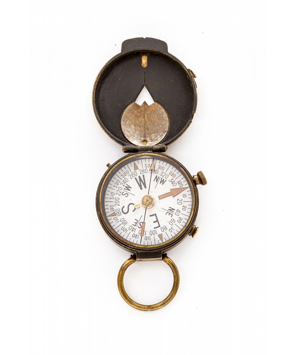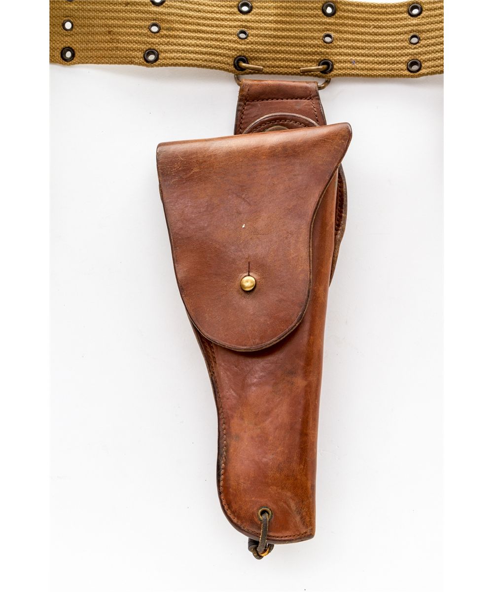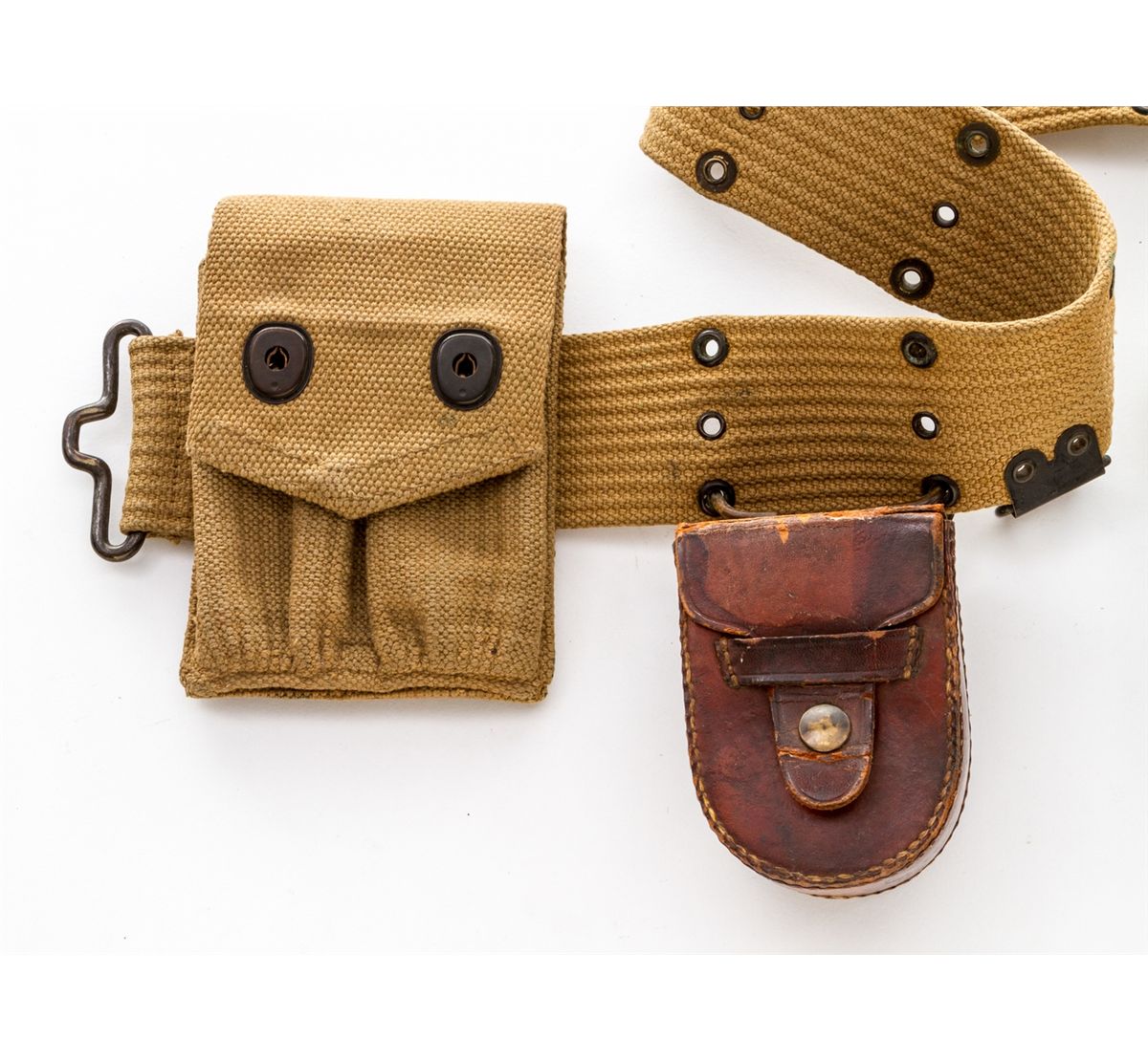 U.S. Officer's Pistol Belt, Holster, 1st Aid Kit, Mag Pouch, Leather Compass Pouch, and Engineer's Compass. A late Model 1912 rig dating from 1918, with private purchase brown russet unmarked 1912 holster with leather thong; pistol belt by Russell dated June 1918 with saber ring; RIA 1918 dated 1st aid kit with brass kit by Bauer & Black, Nov. 2, 1916 dated contract, with Cavalry device to outside top flap; Russell 1918 two-cell mag pouch; brown leather compass pouch lined in blue felt, with U.S. marked Swiss made compass by Plan Ltd. All items are in excellent condition, with light crazing and separation to top edge flap of compass pouch and fading to 1st aid kit pouch. Est.: $450-$600/lot.