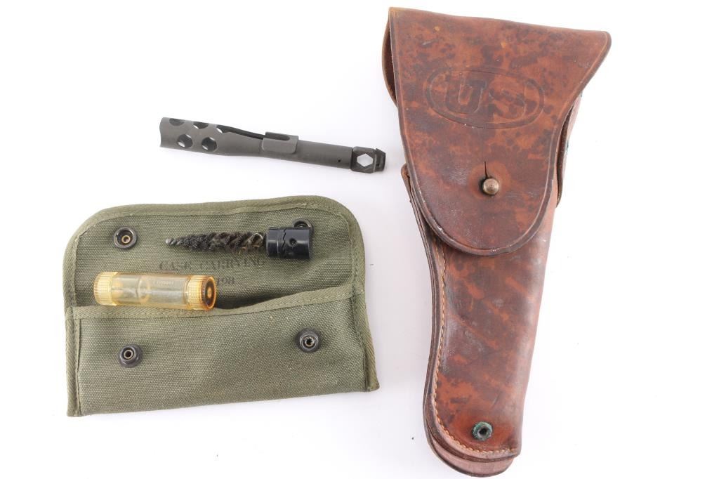 U.S. WW2 brown leather flap holster for the m1911a1 pistol, rear stamped "Boyt 42". stitching intact, very good condition. Also included is a early Vietnam U.S. M14 rifle cleaning kit, complete in OD green pistol belt carrying case.