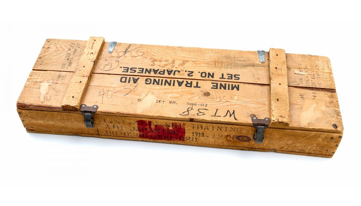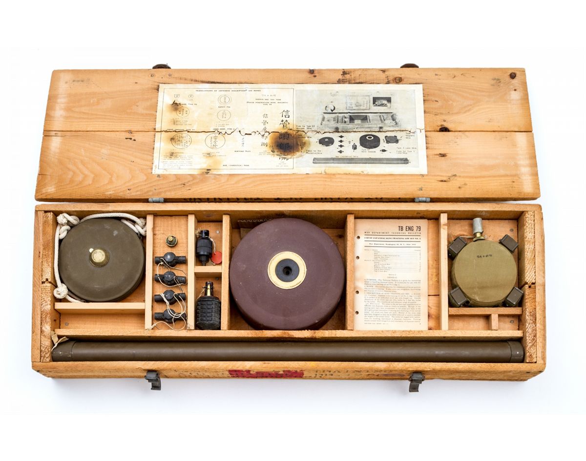 U.S. WWII Mine Training Aid, Set No. 2, Japanese, complete with all components including manual, in original transit box. All in excellent condition and appearing near new. Seldom seen complete. Top label with some toning from contact with wood. Nearly 70 years old. Est.: $1,200-$1,800.