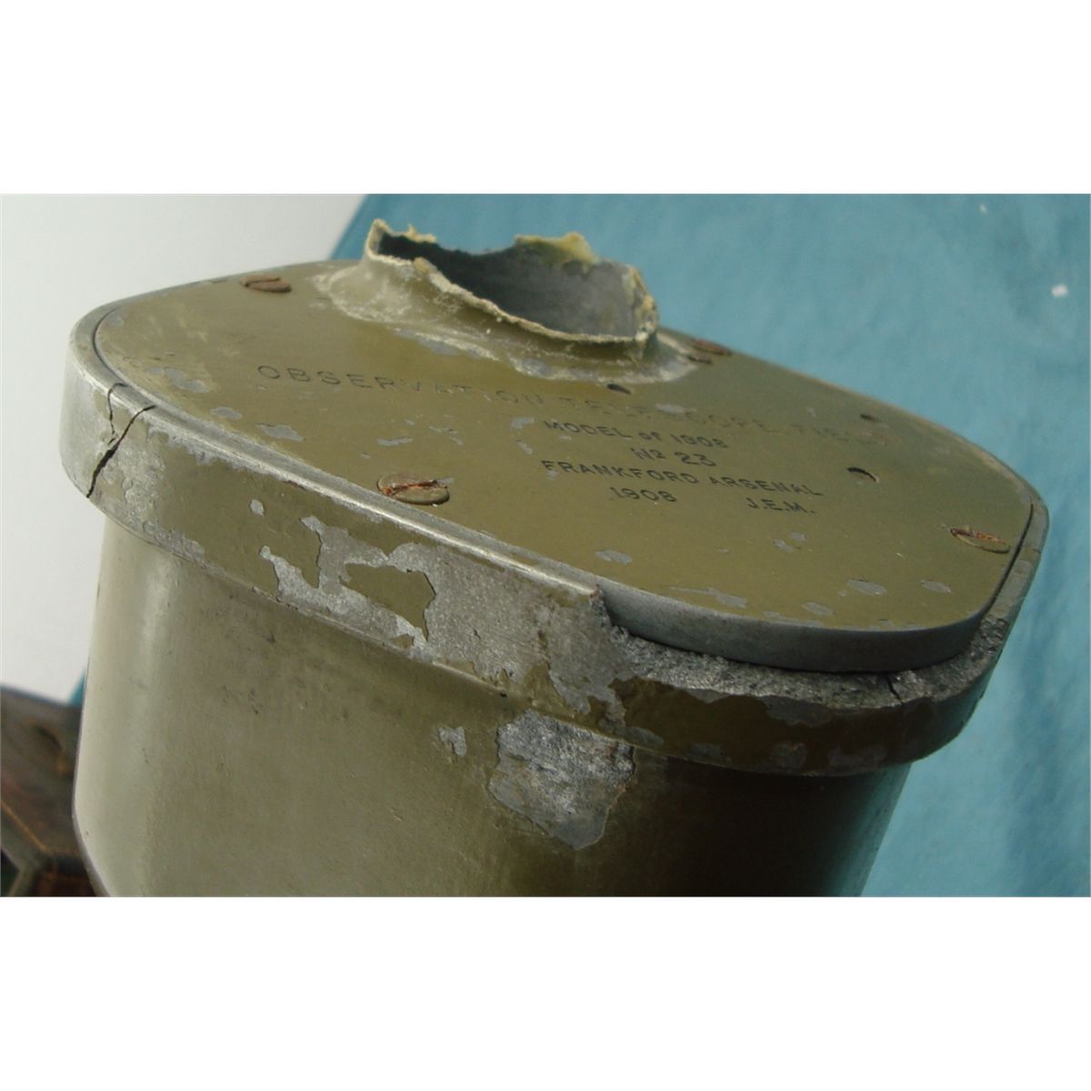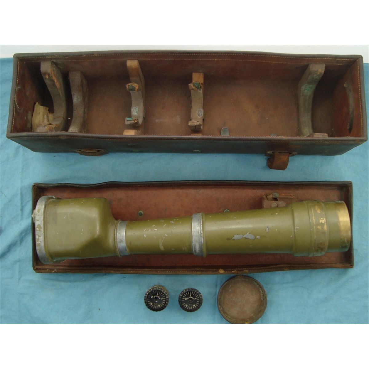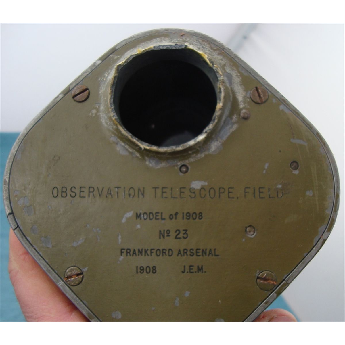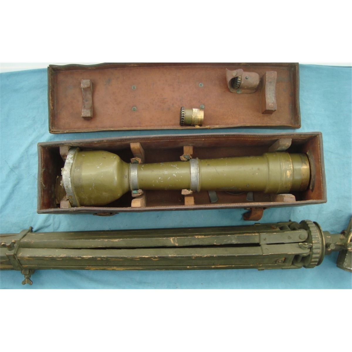 marked "Model of 1908 NO 23 Frankfurt Arsinal 1908 JEM". In original leather case w/the original Frankfurt Arsinal marked tri-pod. The scopes eye peice mase of cast is broken off as well as some cracks & breaks on the overall housing. Comes w/15 & 30 power eyepeice, original carry case & leather lens cover all of which are in good overall condition. An early US field piece which would make a nice disply & worthy of restoration.