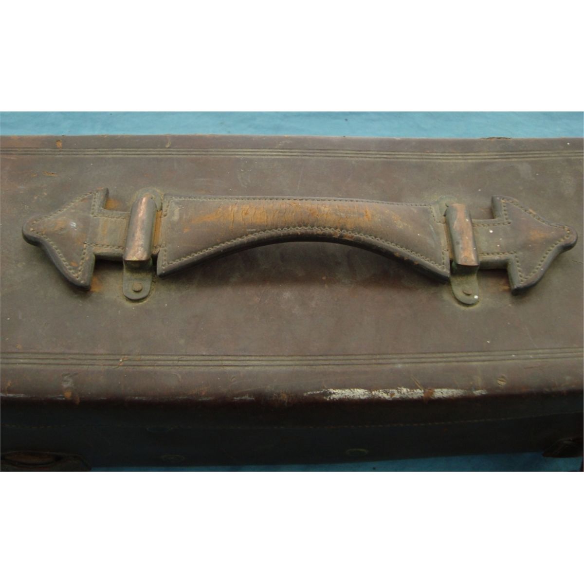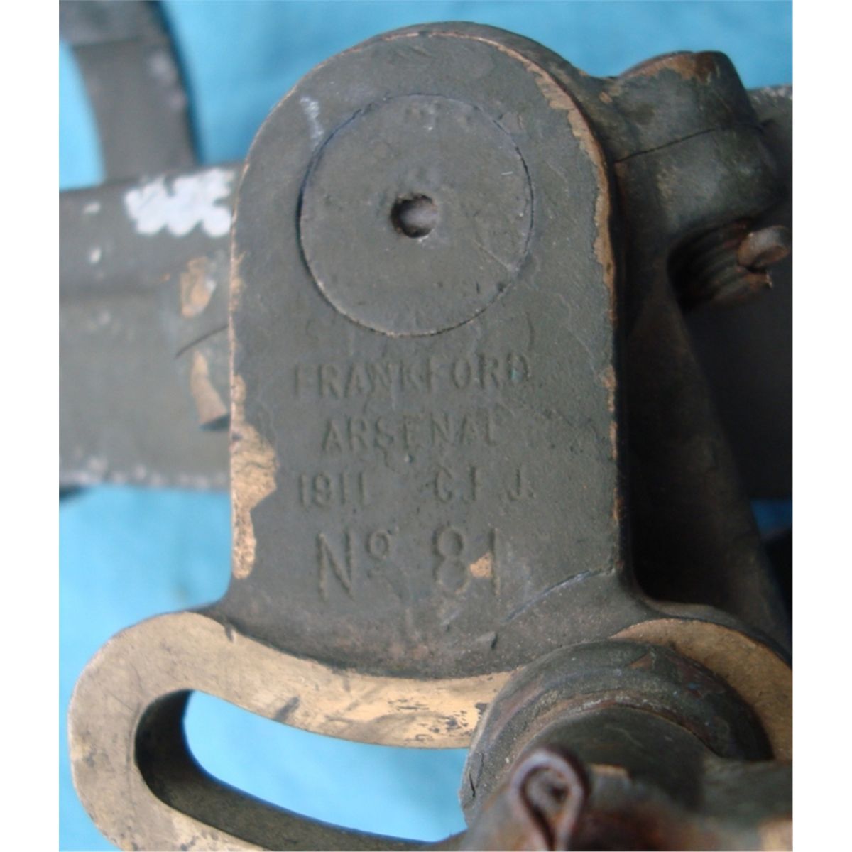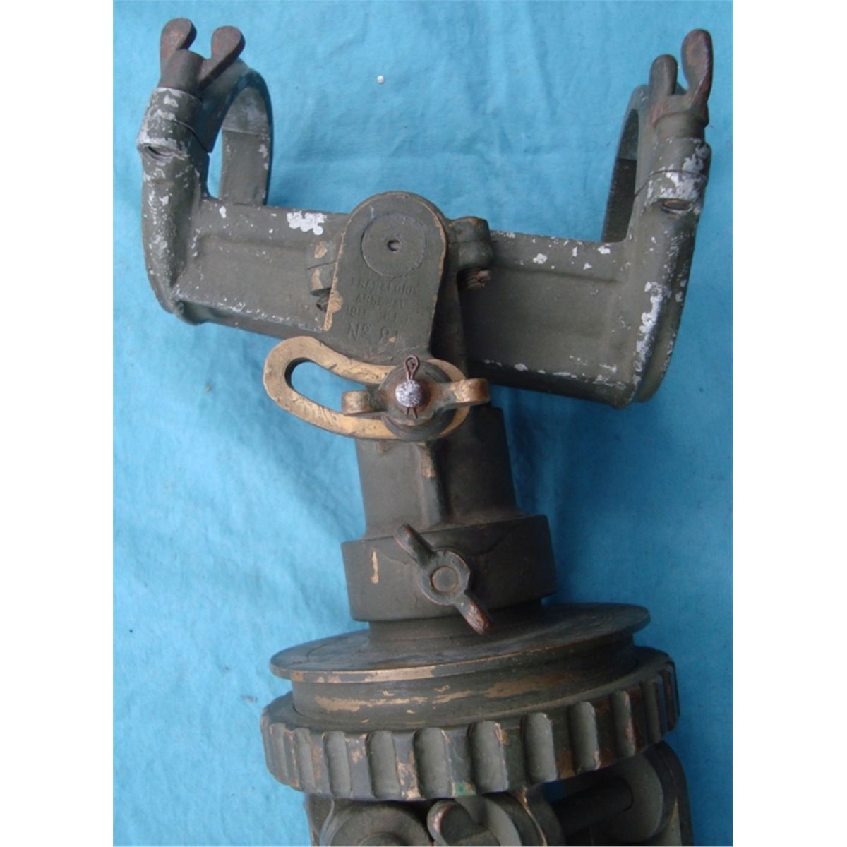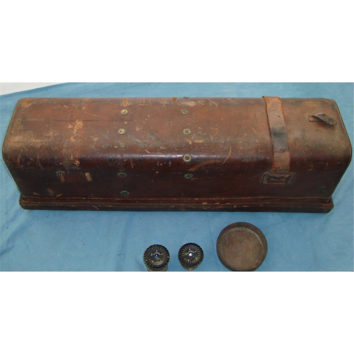 marked "Model of 1908 NO 23 Frankfurt Arsinal 1908 JEM". In original leather case w/the original Frankfurt Arsinal marked tri-pod. The scopes eye peice mase of cast is broken off as well as some cracks & breaks on the overall housing. Comes w/15 & 30 power eyepeice, original carry case & leather lens cover all of which are in good overall condition. An early US field piece which would make a nice disply & worthy of restoration.