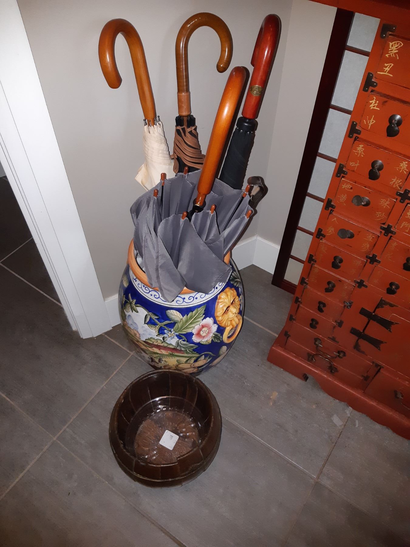 Umbrellas, in large ceramic planter 12x18 and wood barrell planter. pickup 9am