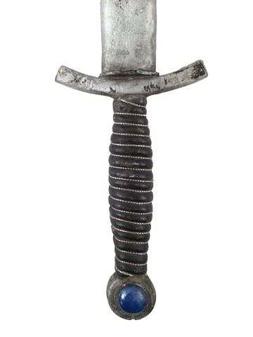 Screen used, production distressed Death Dealer dagger with irremovable sheath. The dagger handle has black grip with a silver colored lacing. The bottom of the handle has a round blue gem. Gem is not real. Item may slightly vary from picture. (approx. 19" x 4")