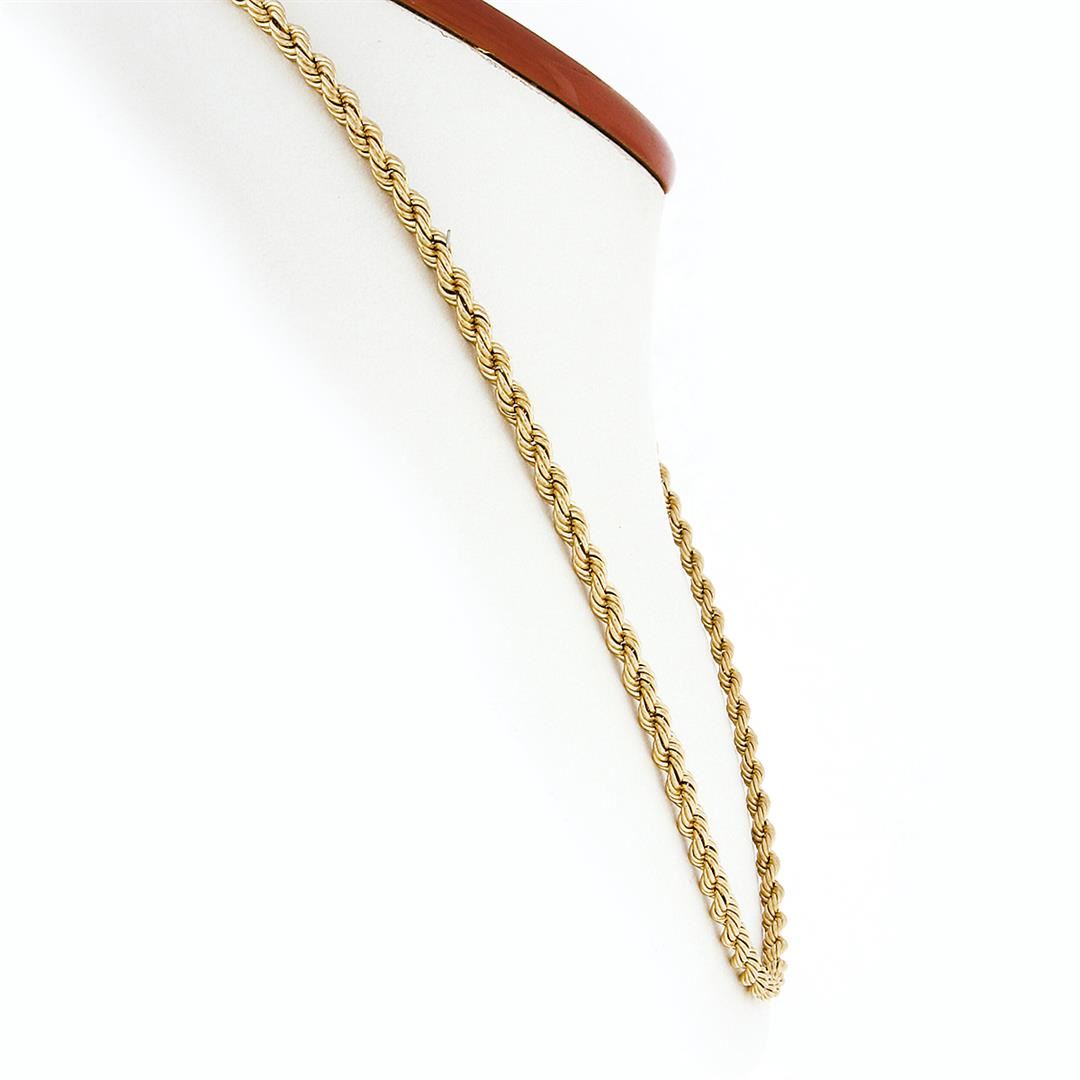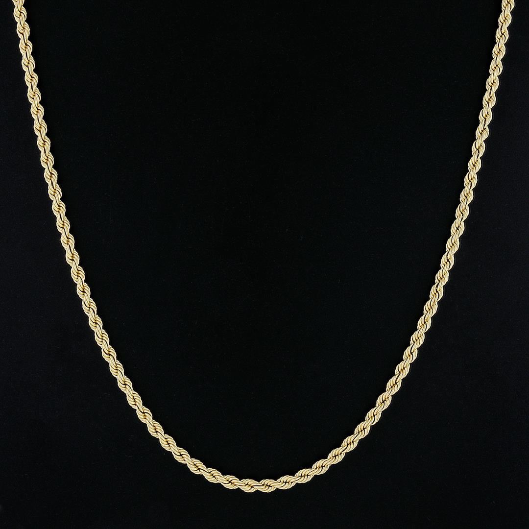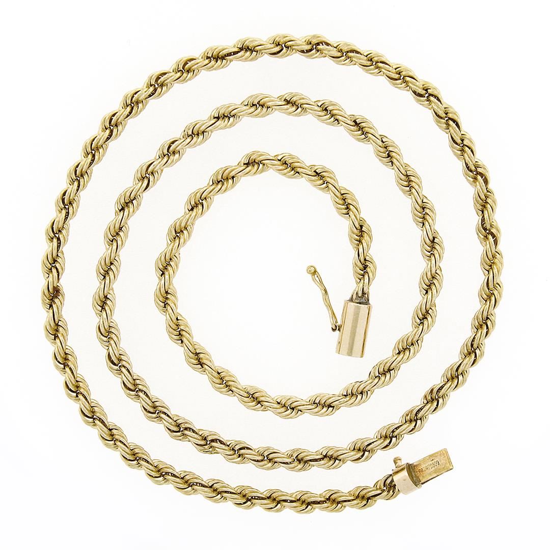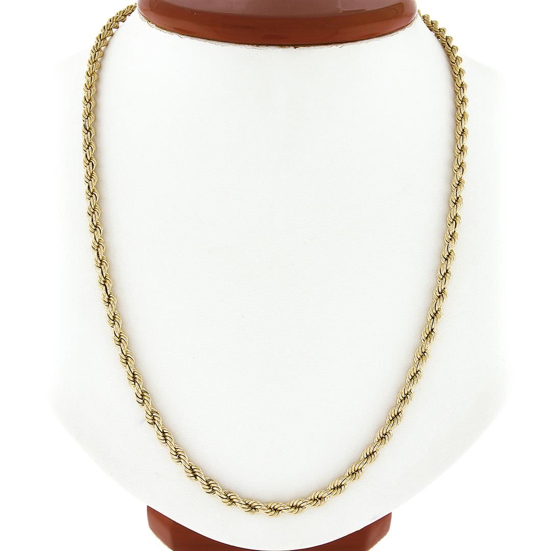 A solid 14k yellow gold rope link necklace. It weighs a total of 31.0 grams, measures 4mm wide, and measures 20.5 inches in length.