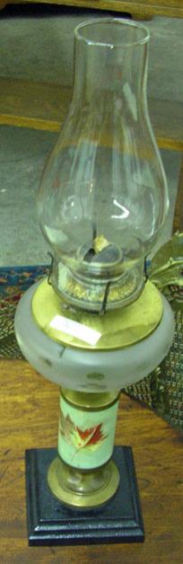 Unusual Oil Lamp, Metal Base, Porcelain Pedestal And Etched Glass Oil Receptacle