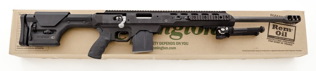 Upgraded Remington Model 700 SPS Tactical Bolt Action Rifle, in MDT TAC21 chassis, #RR71923C, .308 cal., heavy barrel with an overall length of 22'' which includes the Precision Armament muzzle brake, metal surfaces with a matte black finish. The Modular Driven Technologies TAC21 chassis turns the Model 700 into an external box-fed magazine rifle with a free-floating barrel and full pistol grip; chassis features a matte black finish, full-length upper accessory rail, right side and bottom with additional 6'' & 4'' rails. The Magpul PRS stock with adjustable length of pull and cheekpiece height. Rifle also features an Atlas bi-pod and two (2) magazines. Included is the original box with matching end label and original synthetic ''ghille'' green stock. Condition is excellent overall. Matte finish on the chassis shows scattered light rub marks from handling and range use. Adjustable stock pieces function properly. Action is smooth with a mirror bright bore. Est.: $1,200-$1,800. (Modern)