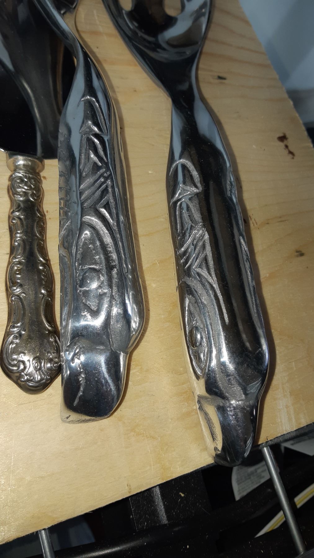First Nation utensils. Metal candle holders and porcelain dog made in Japan . Pickup at 9 am