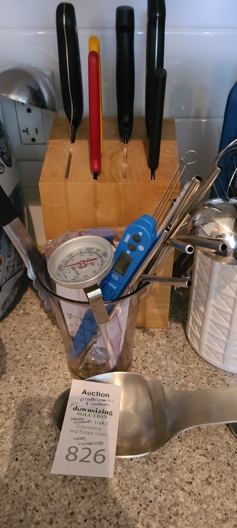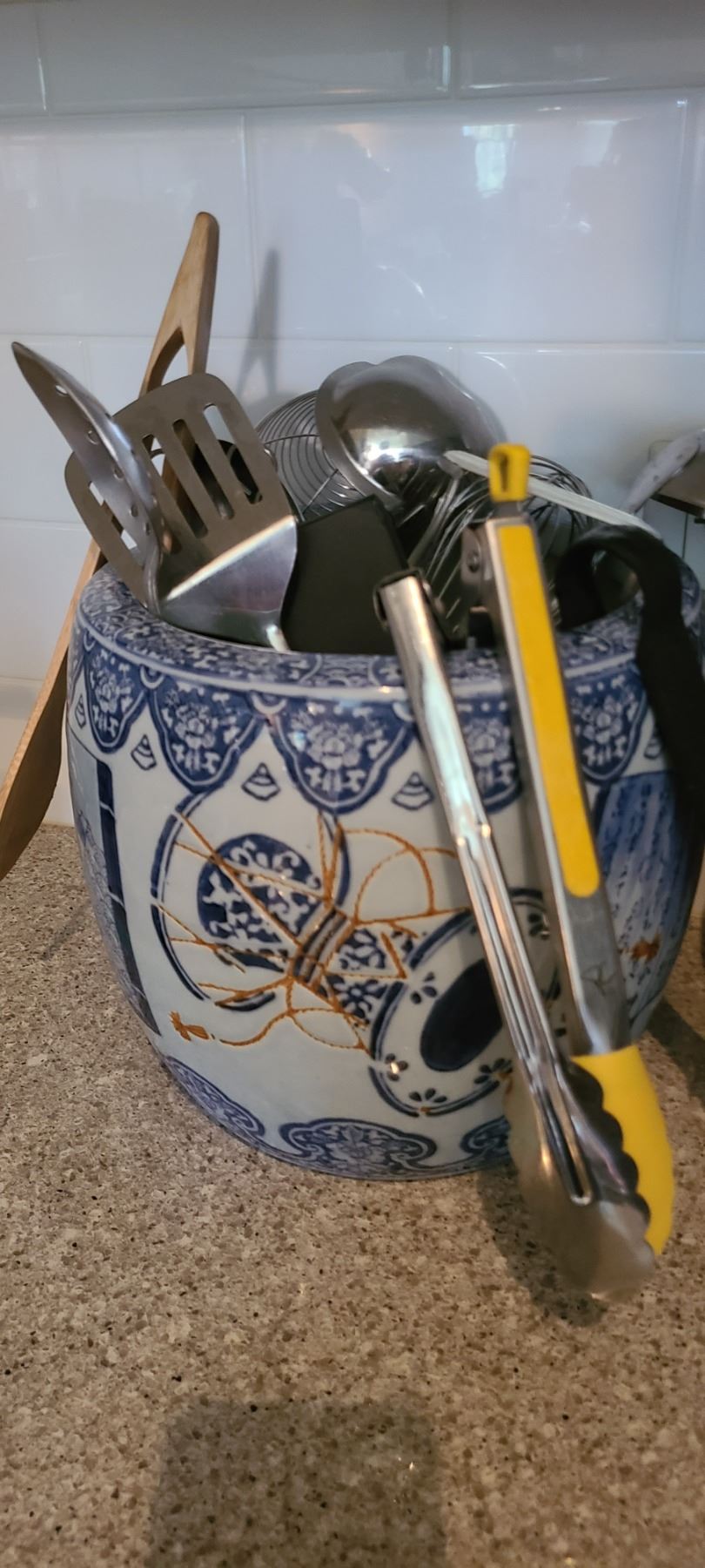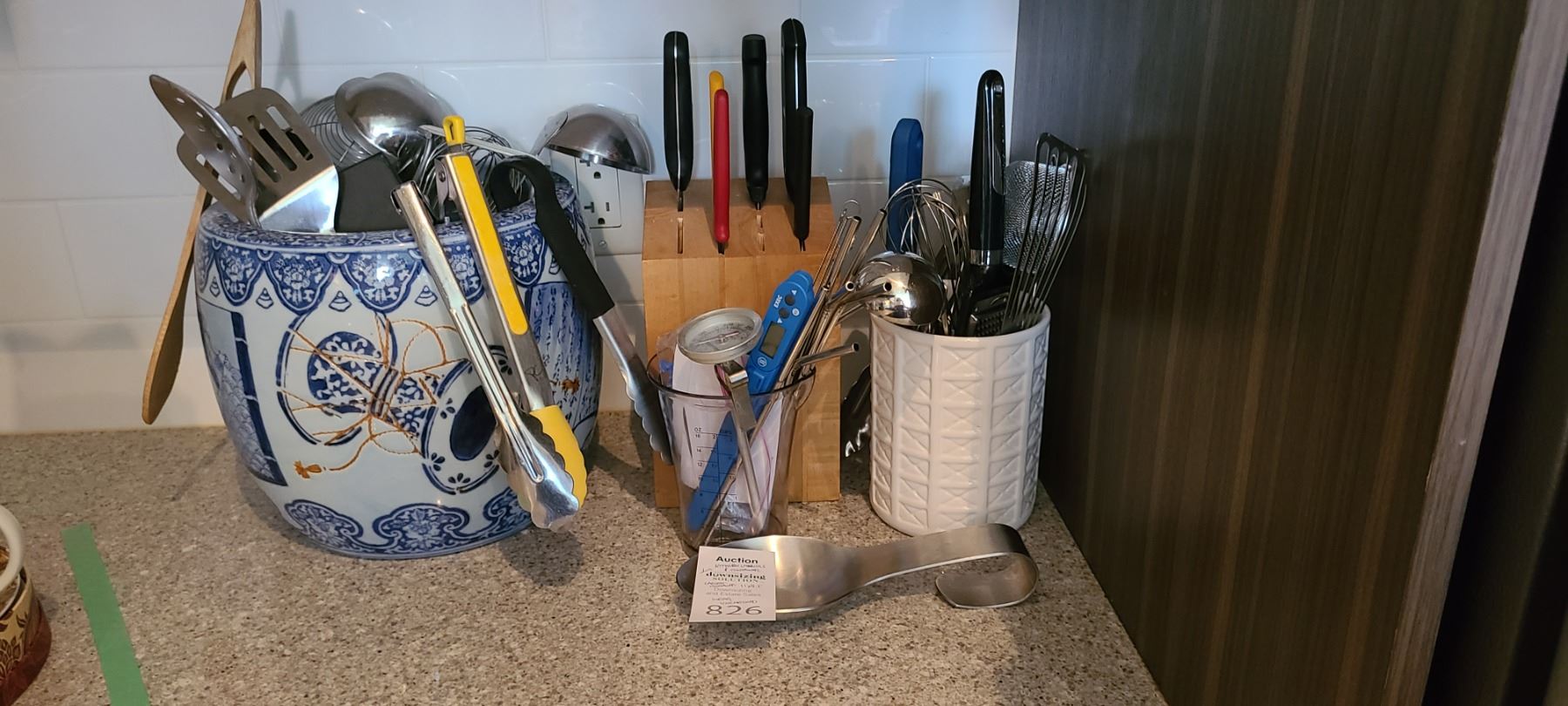 Utensils in large ceramic bowl, knives and more , pickup 11 am