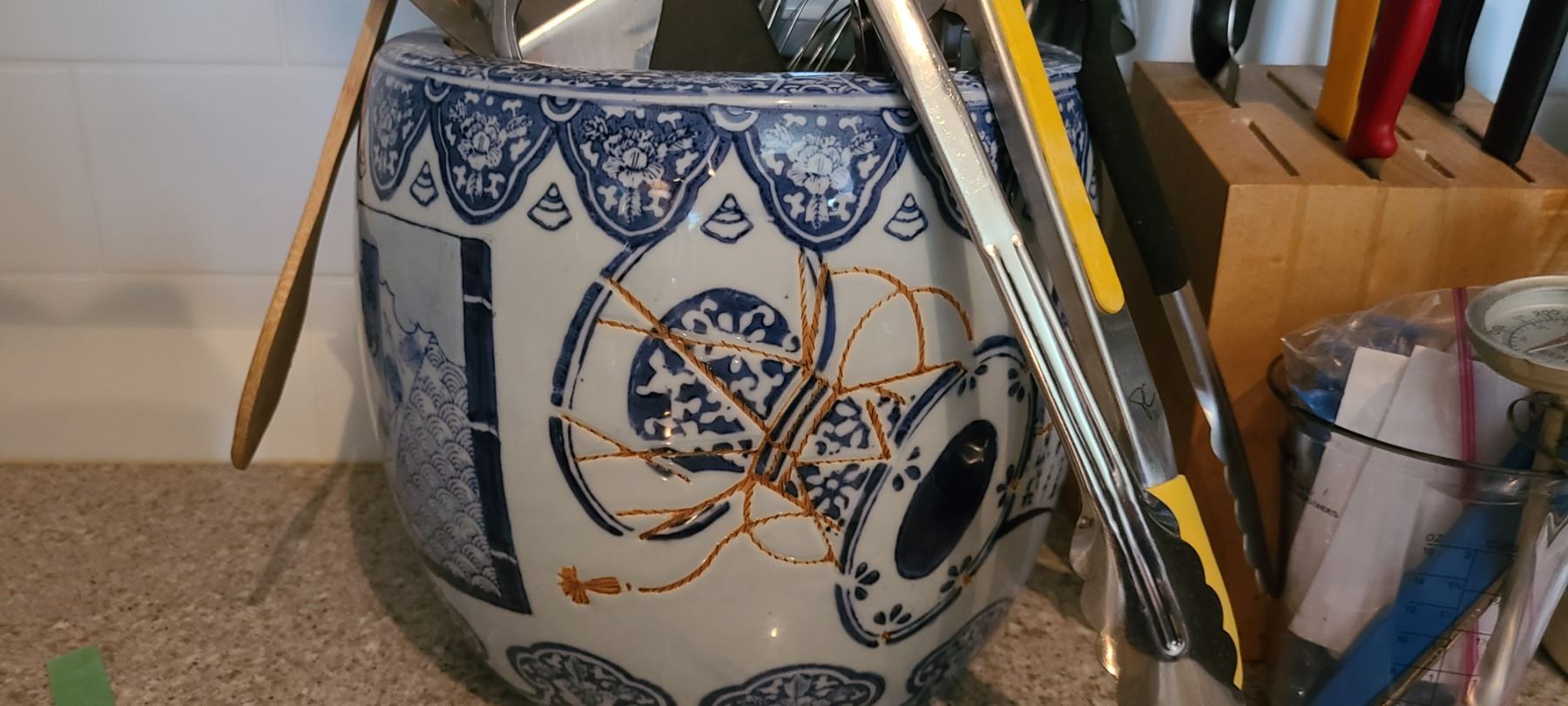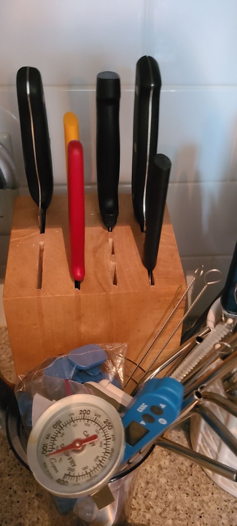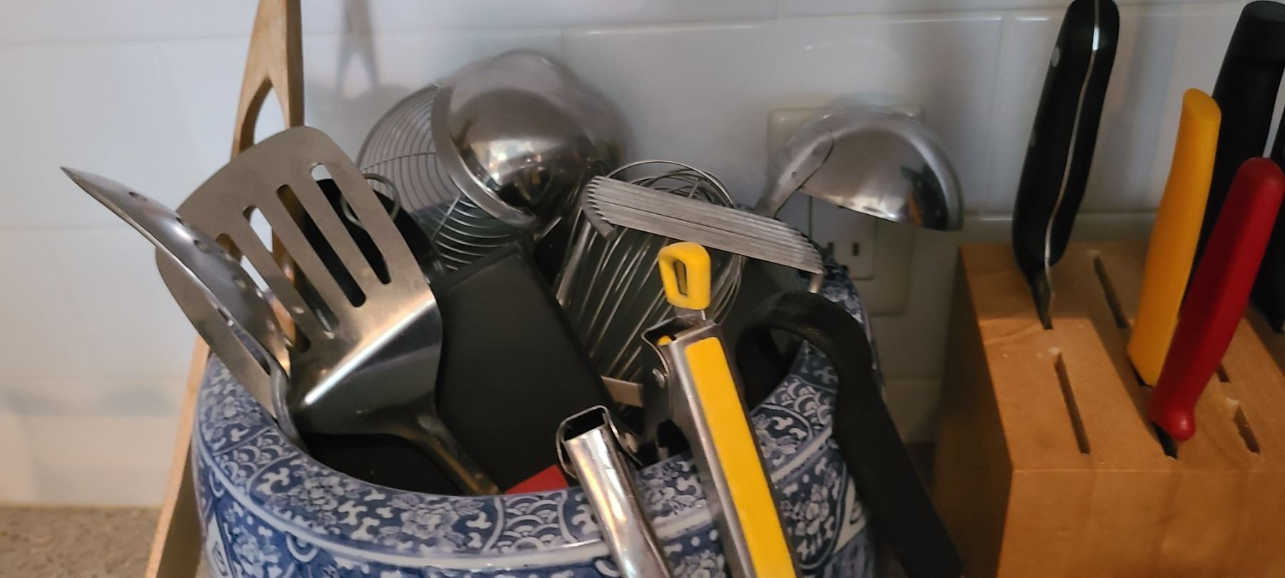 Utensils in large ceramic bowl, knives and more , pickup 11 am