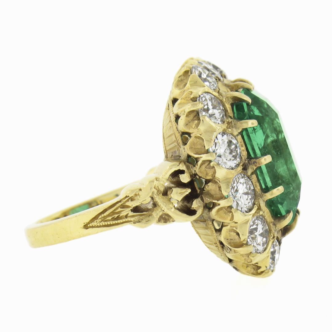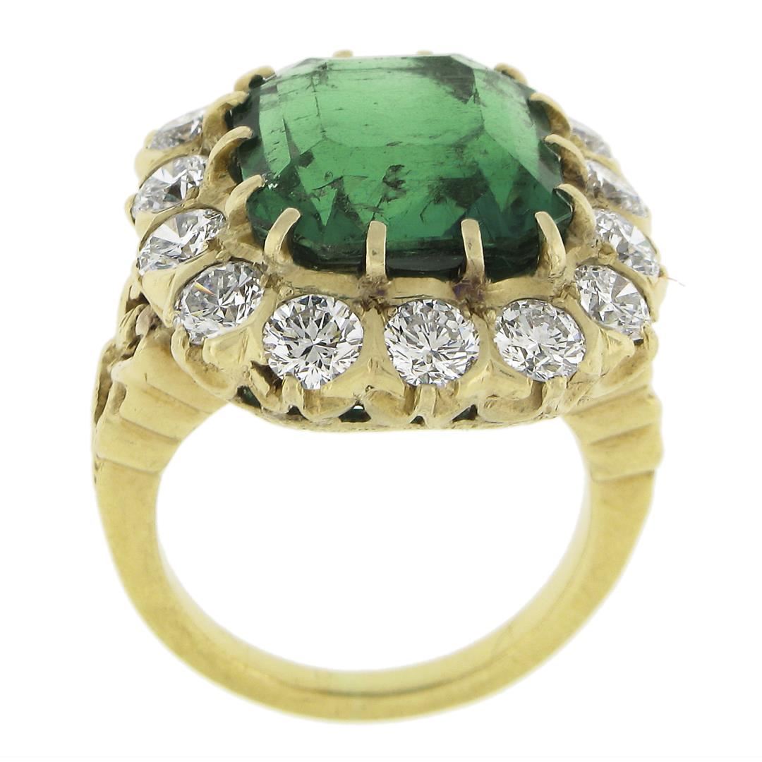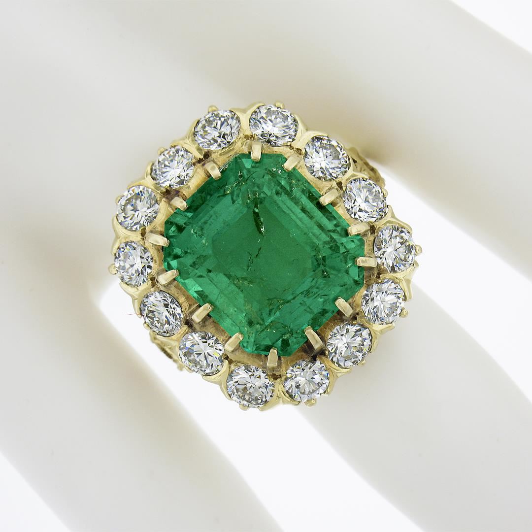 A solid 18k yellow gold cocktail ring, with 1 AGL graded emerald cut natrual colombian emerald (11.5ct ), surrounded with a halo of 14 round cut natural diamonds (F/G - VS1/VS2 ; 2.80ctw). The ring is size 6.5, weighs a total of 13.68 grams, and measures 23mm wide. Comes with all original relevant certifications.