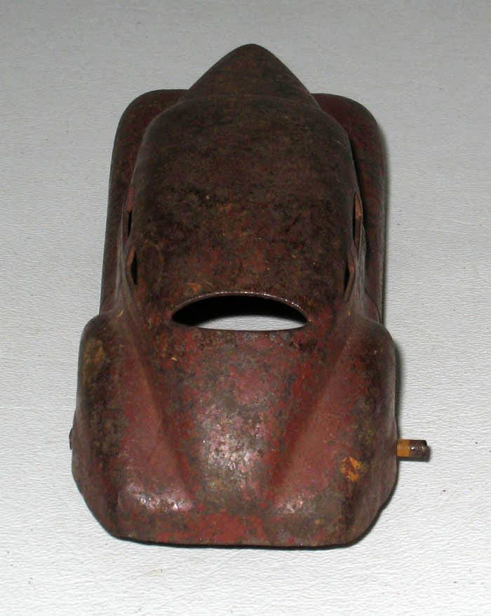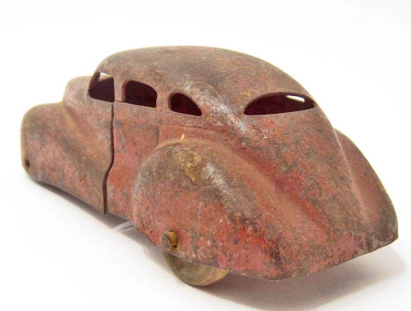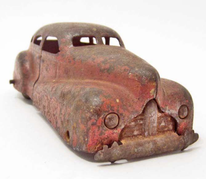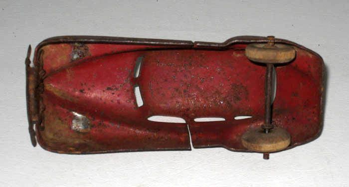 Constructed with pressed steel. Measures approx 5-3/4" long. Shows wear and little paint left, missing front axel and tires. tires show some wear. No manufacturer marks.