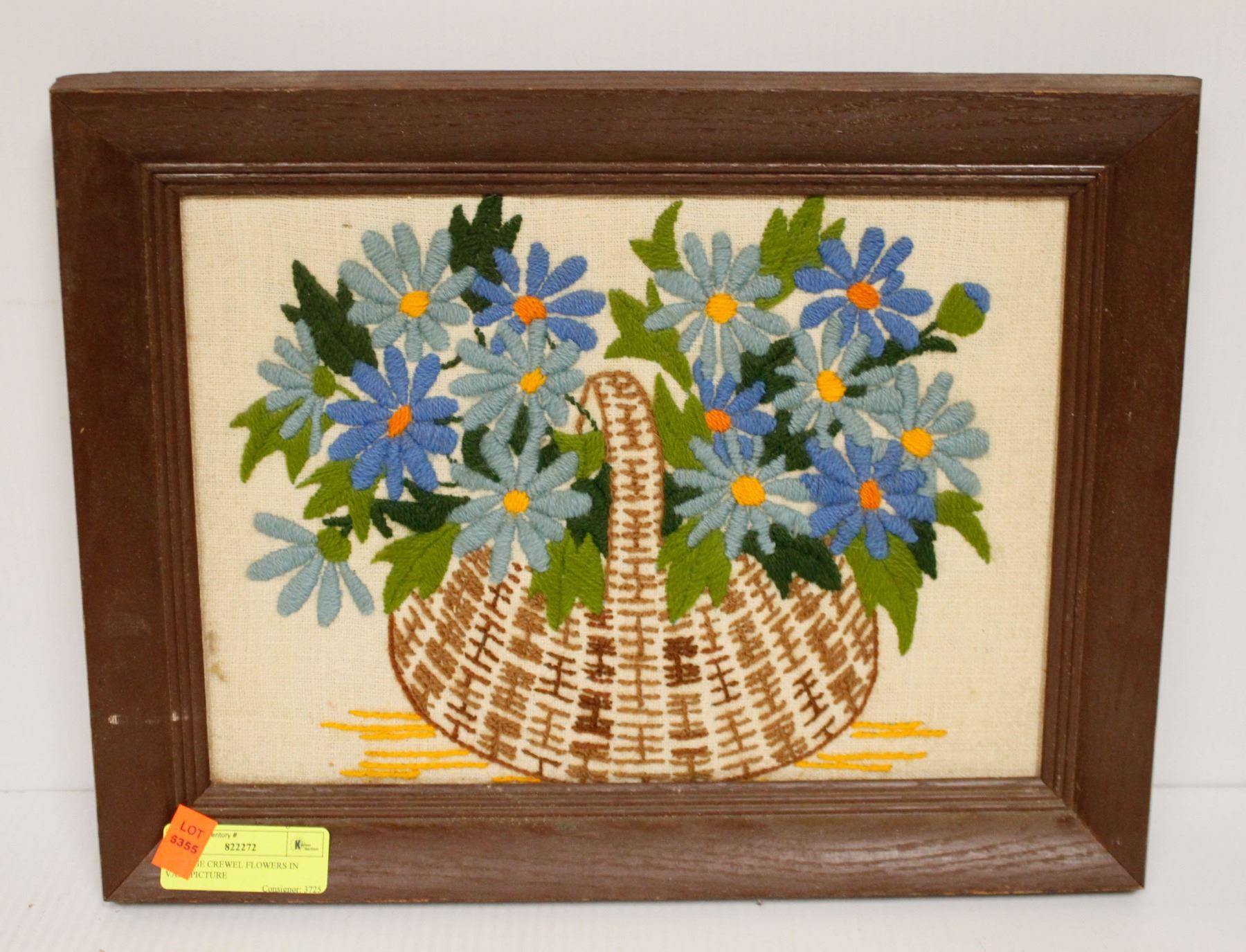 VINTAGE CREWEL FLOWERS IN VASE PICTURE. 17 X 13