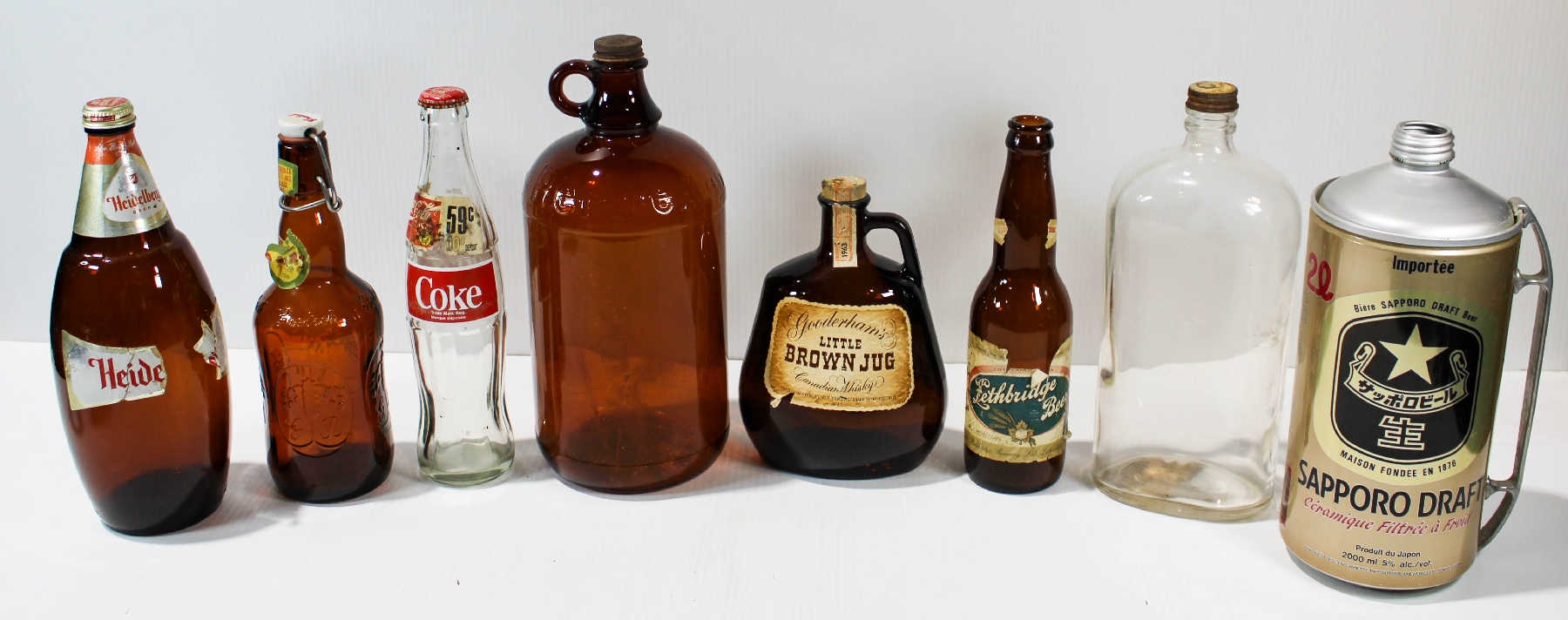 VINTAGE GLASS BOTTLES & TIN COCA COLA ETC