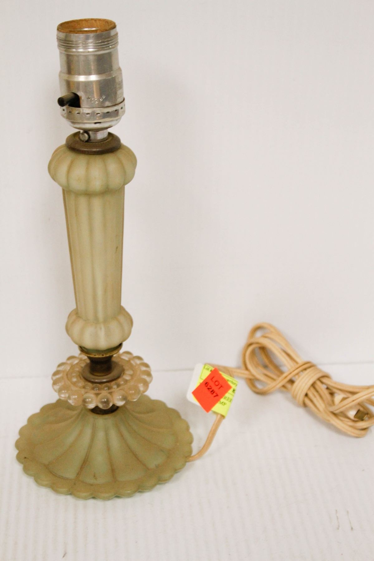 VINTAGE GREEN GLASS BASED TABLE LAMP. 11" TALL