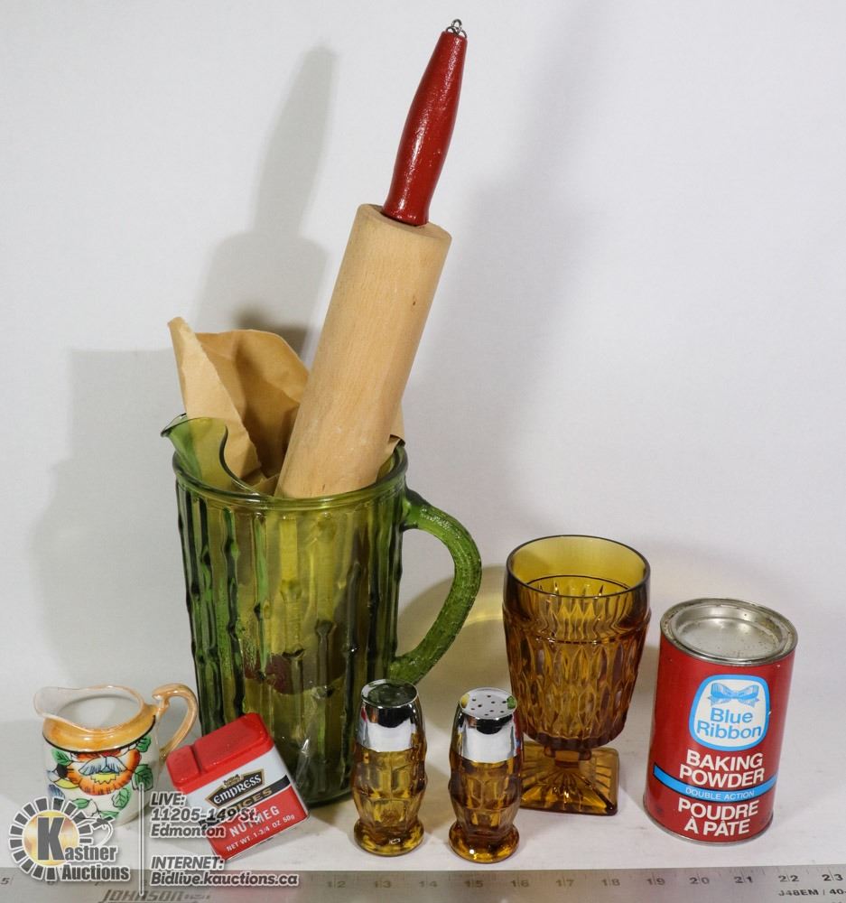 NO CHIPS OR CRACKS. HEAVY AMBER SALT AND PEPPER SHAKERS AND GOBLET. GREEN GLASS PITCHER. WOODEN ROLLING PIN, CREAMER - MADE IN JAPAN , BAKING POWDER AND NUTMEG