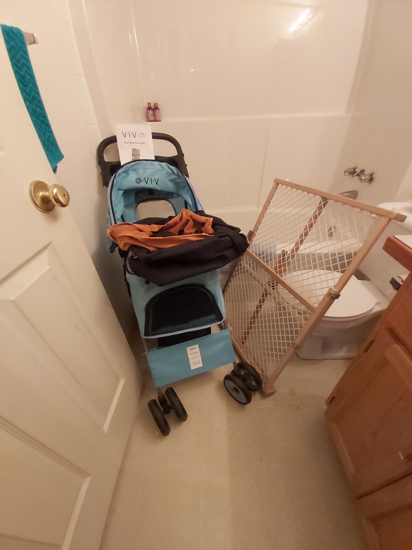 VIV pet stroller, pet bed and gate. Pickup at 11 am