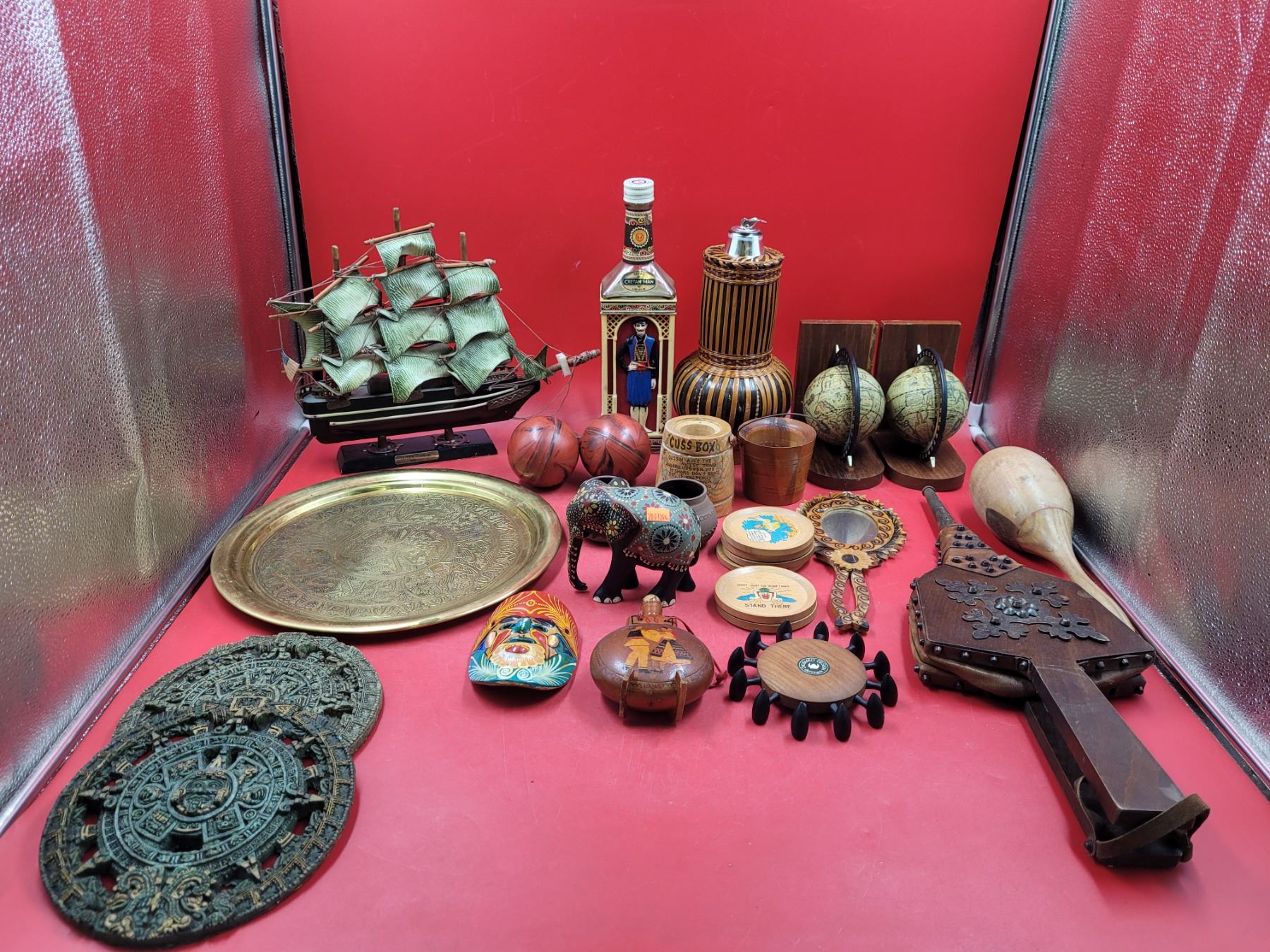 VTG Collectibles Lot w/ Fireplace Bellow, Globe Bookends, Ship Decor, Mayan Calendar Plates, & More