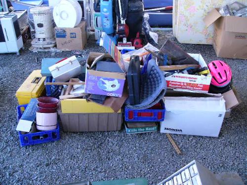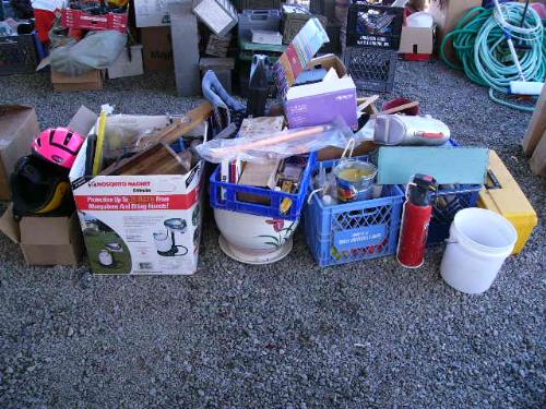 Various carpentry tools; helmets; various caulking; 2 ceramic very nice flower pots; small lot of tick and insect repellant spray; small lot of MRE's; 4 dinner plates; 1 old style metal lunch box with thermos; 1 BC fire extinguisher 5lbs Halon; 1 cassette case with various cassettes mainly Country music (36)