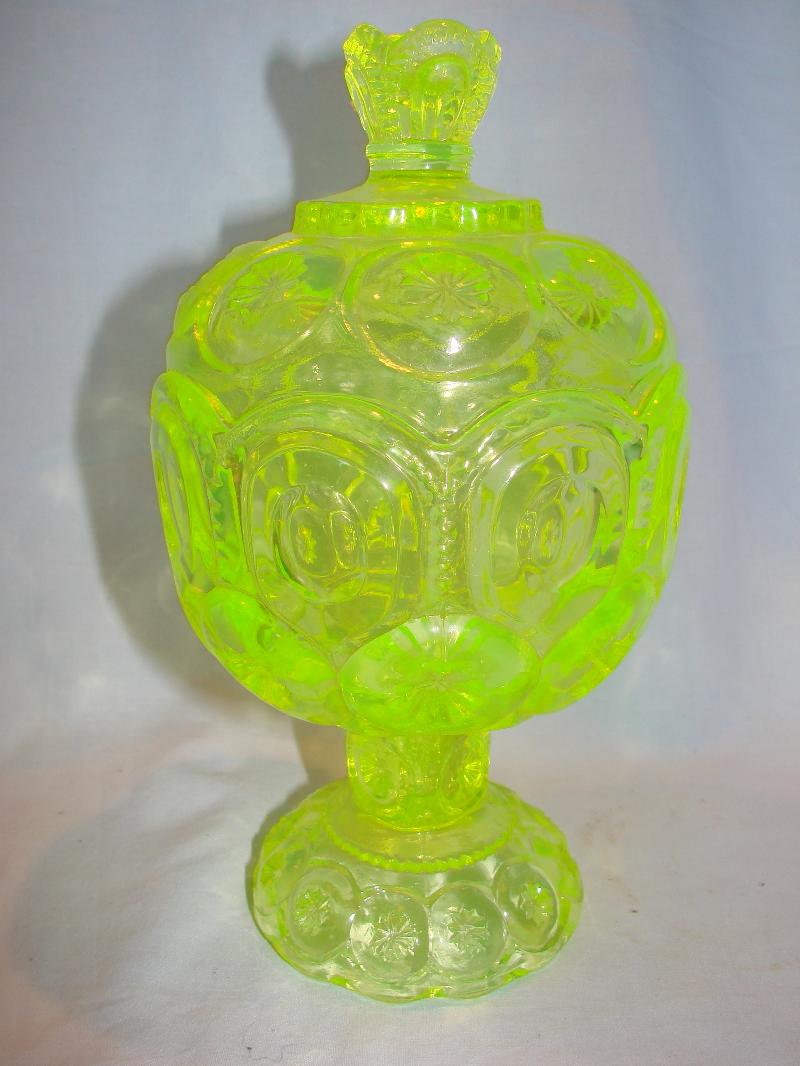 Vaseline glass moon & stars candy dish w/lid, apprx. 8" tall