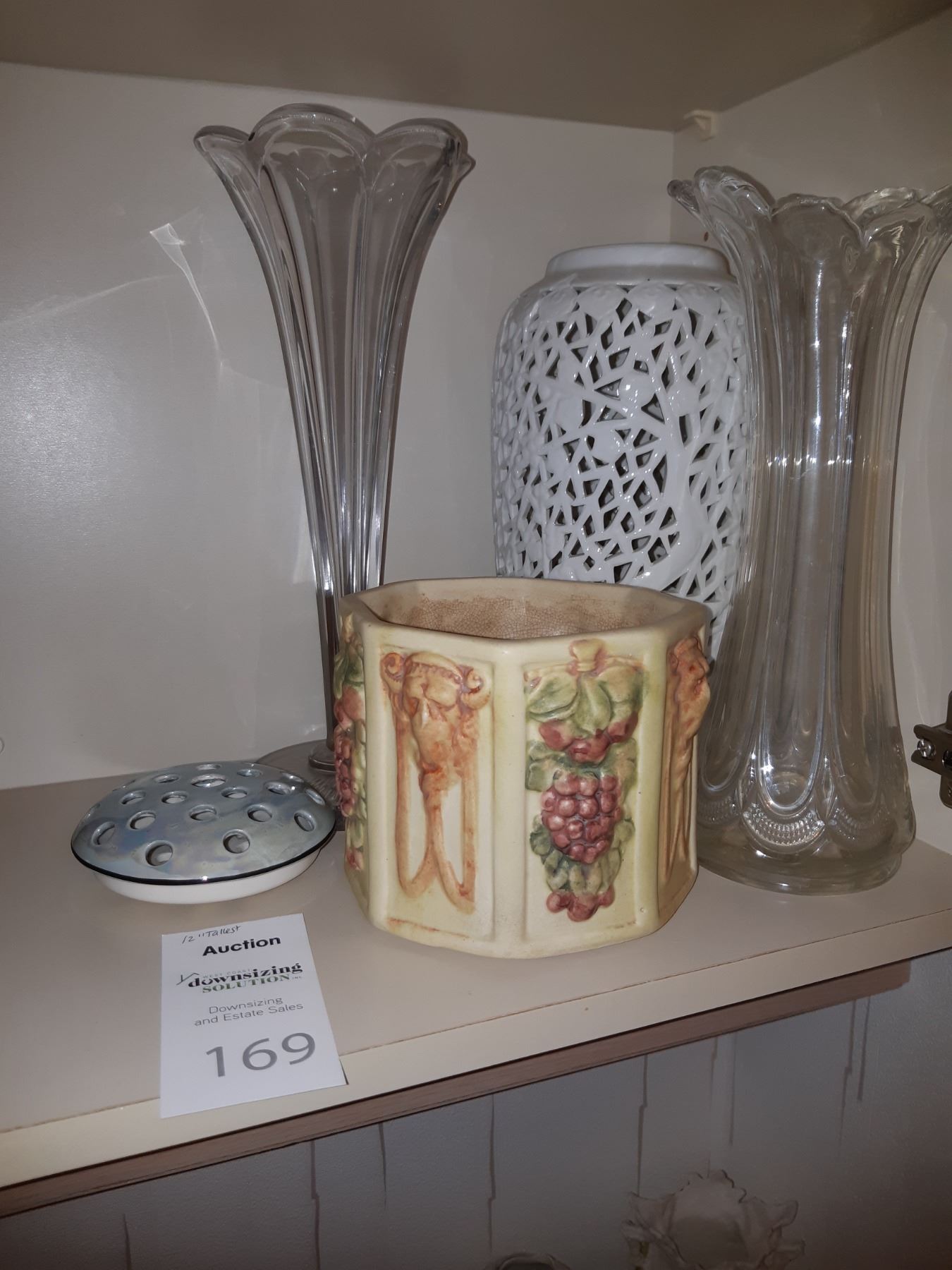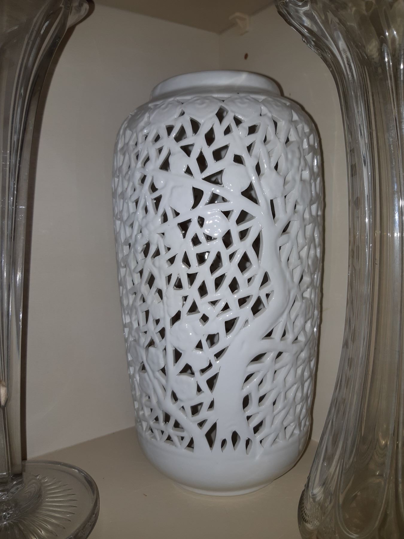 12" tall glass vase. White cutout vpceramic vase 10". And more. Bring packing and pickup at 9 am