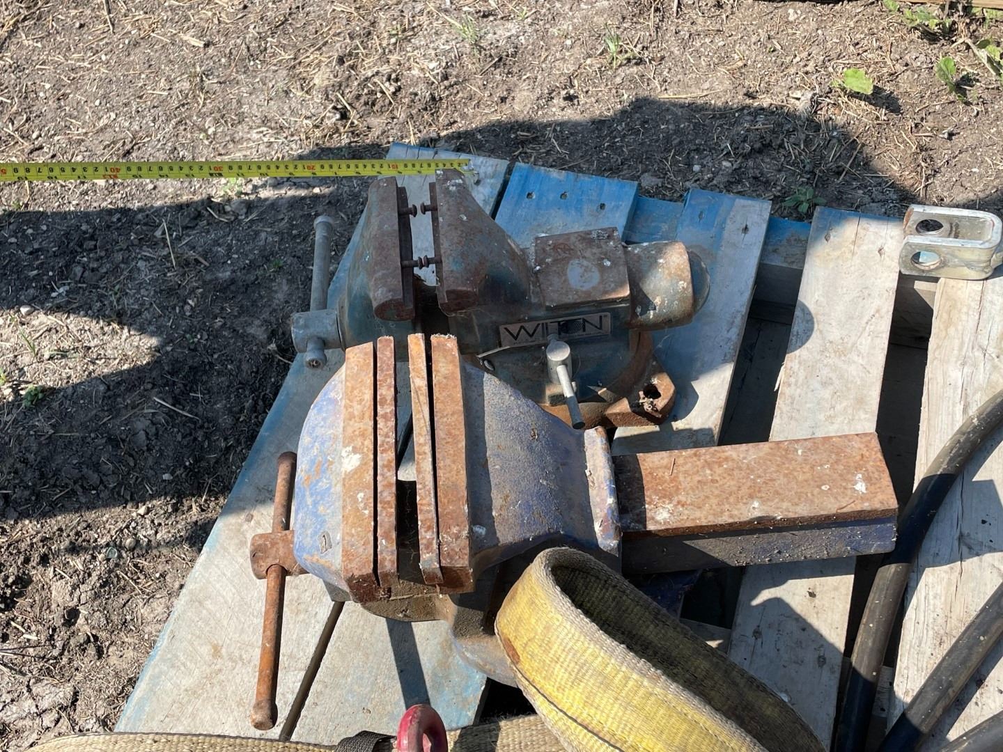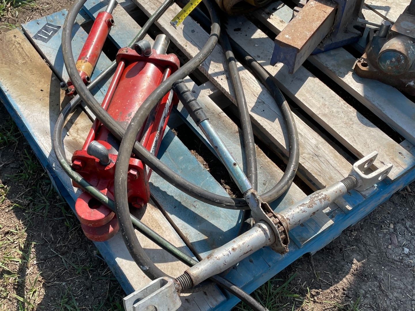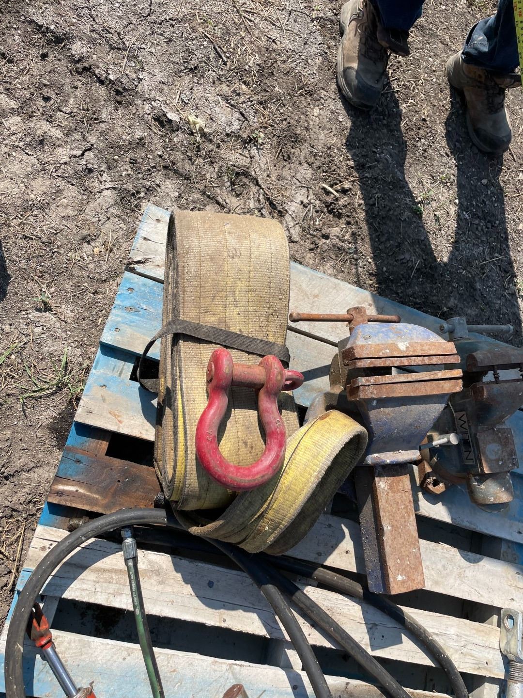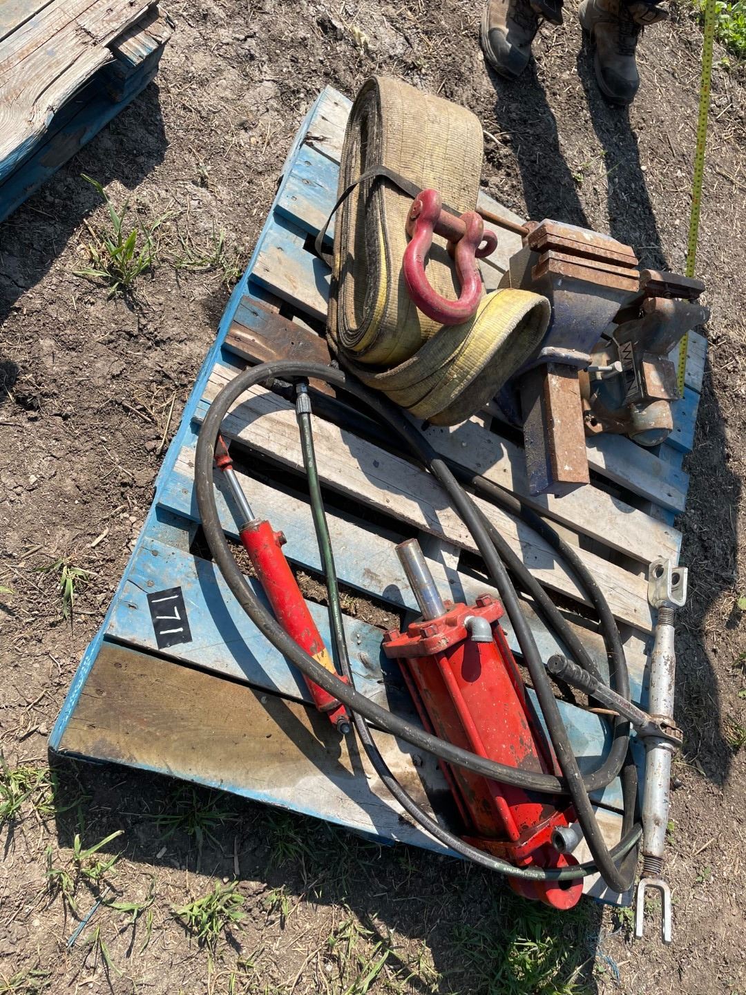 2 vices, assorted hyd cylinders, 8 inch tow strap with clevis