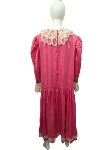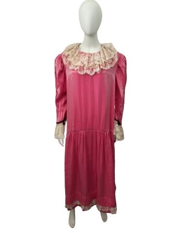 Vintage, antique Victorian Prairie dress. Shiny pink material with lace collar, trim, and cuffs with a lace trim on the bottom. Was made for one of the oldest and largest costume stores in Los Angeles that has been in business for over 75 years. Since it's custom made there is no exact size but measures 51" long and 19" pit to pit.