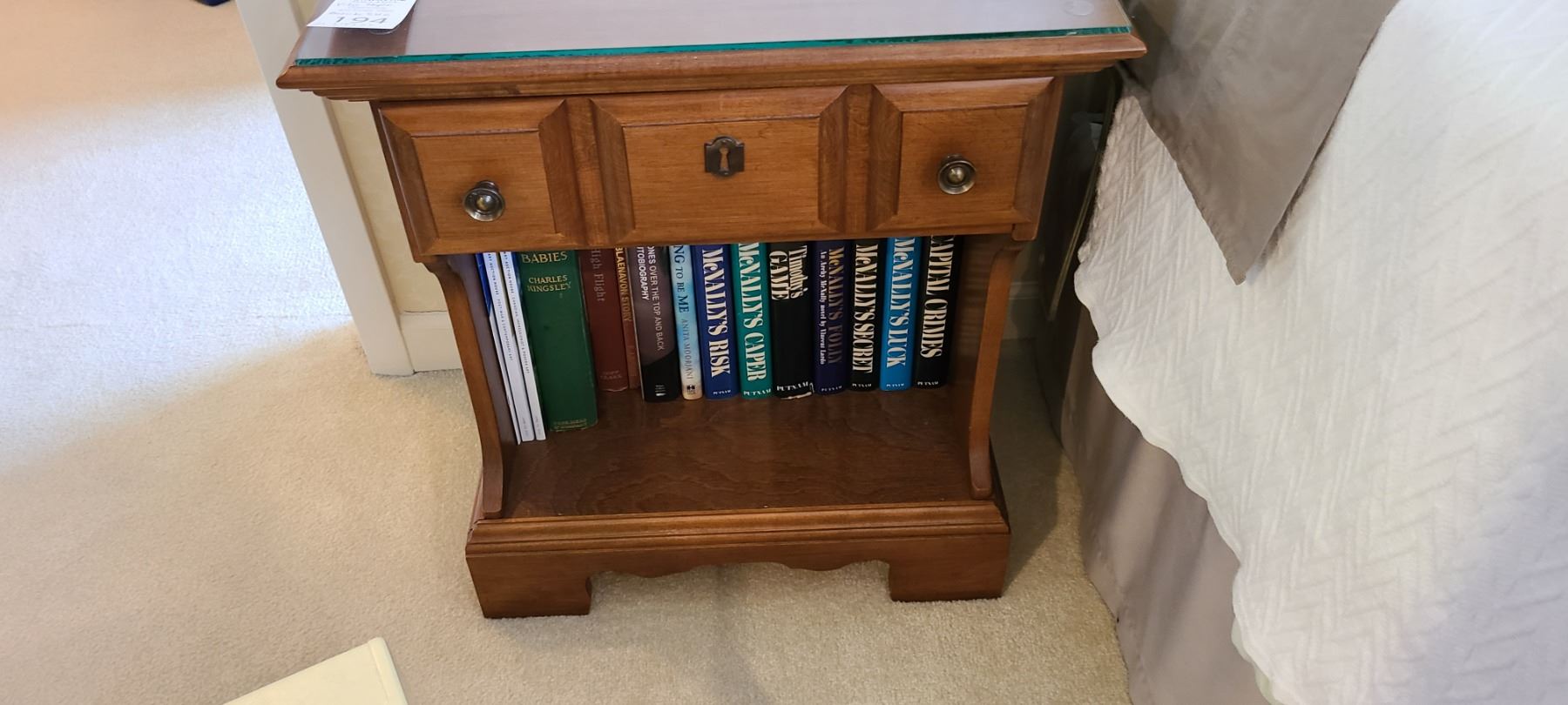 Top has protective cover, one drawer and open cabinet below21x14x24. Contents not included. Very good condition. Pickup at 11 am