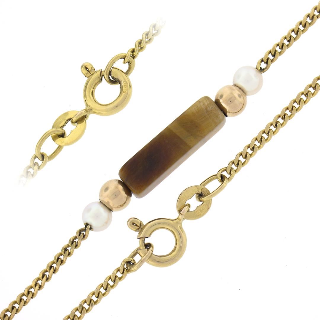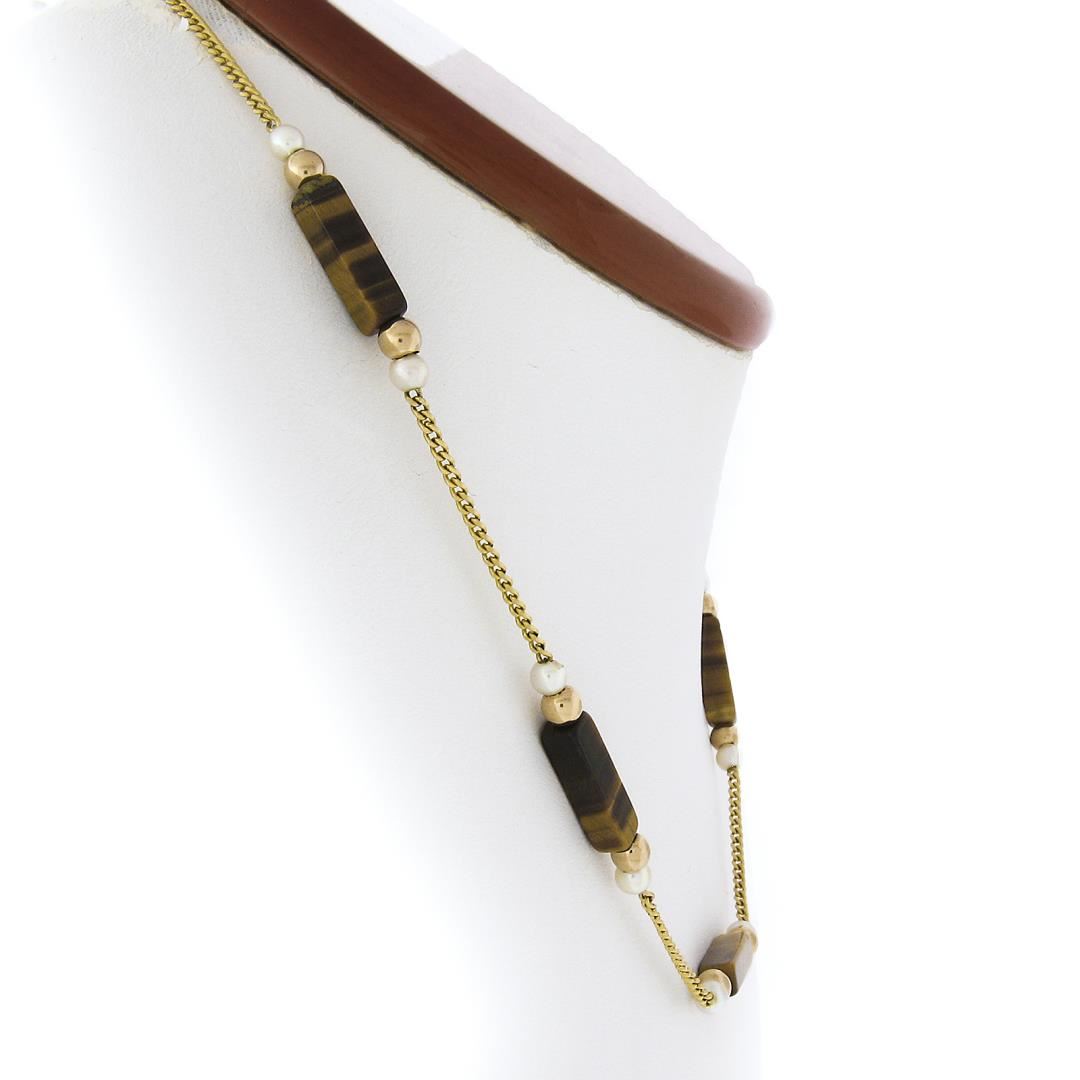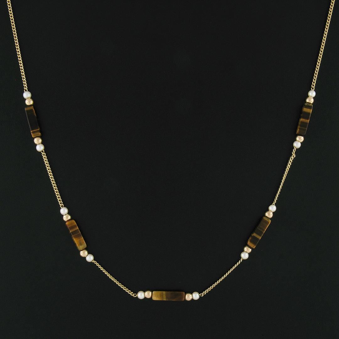 A vintage 10k yellow gold statian necklace, with 5 bar shape natural Tigers eye (14.6mm to 14.8mm), and 10 round shape cultured pearl (3.6mm ). It weighs a total of 6.42 grams, measures 1mm wide, and measures 15.5 inches in length.