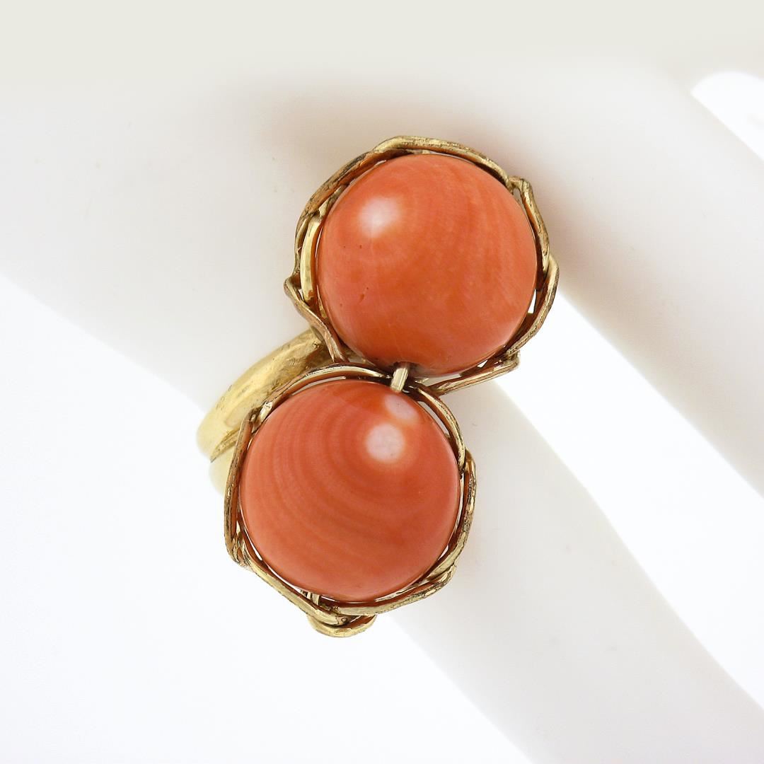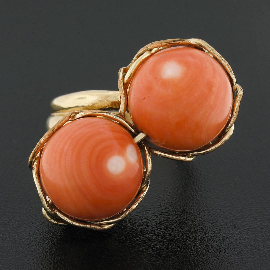 A vintage solid 14k yellow gold bypass ring, with 2 ball shape natural corals (12.4mm eac). The ring is size 4.5, weighs a total of 12.14 grams, and measures 23.3mm wide.
