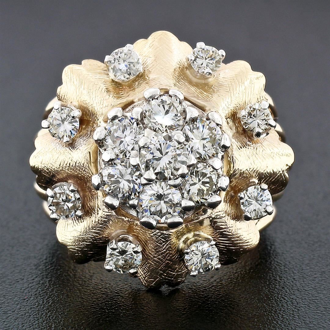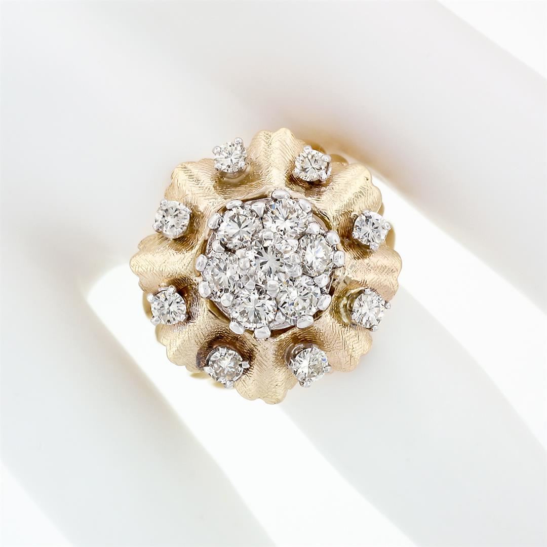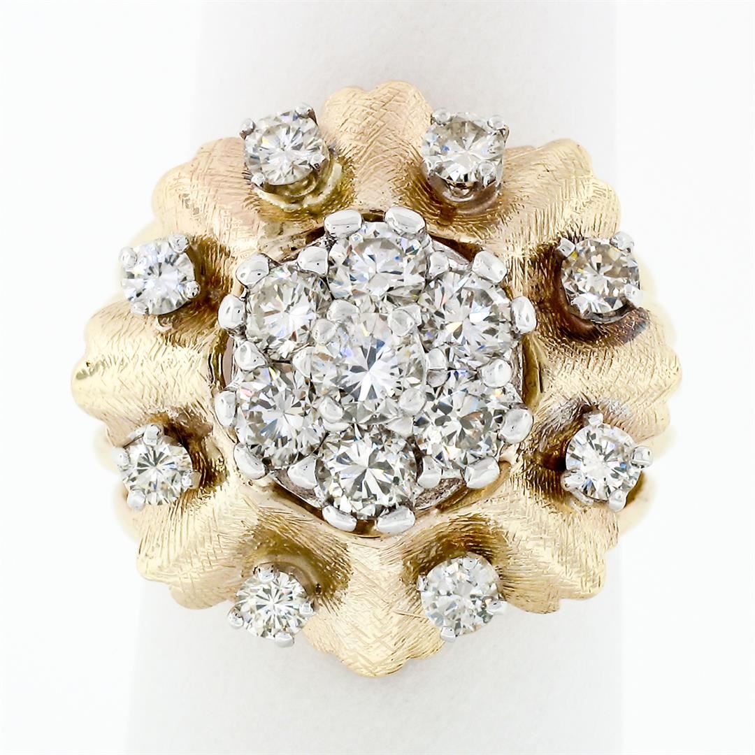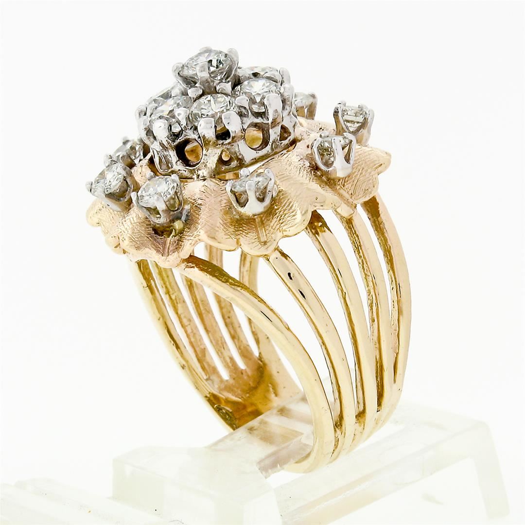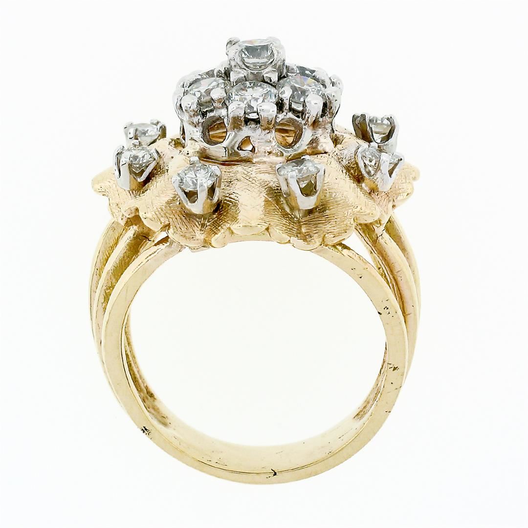A vintage solid 14k two tone gold cluster flower ring, with 15 round brilliant cut natural diamonds (F/G - VS1-SI1; 1.67 ctw). The ring is size 6.5, weighs a total of 10.80 grams, and measures 20.9mm wide.