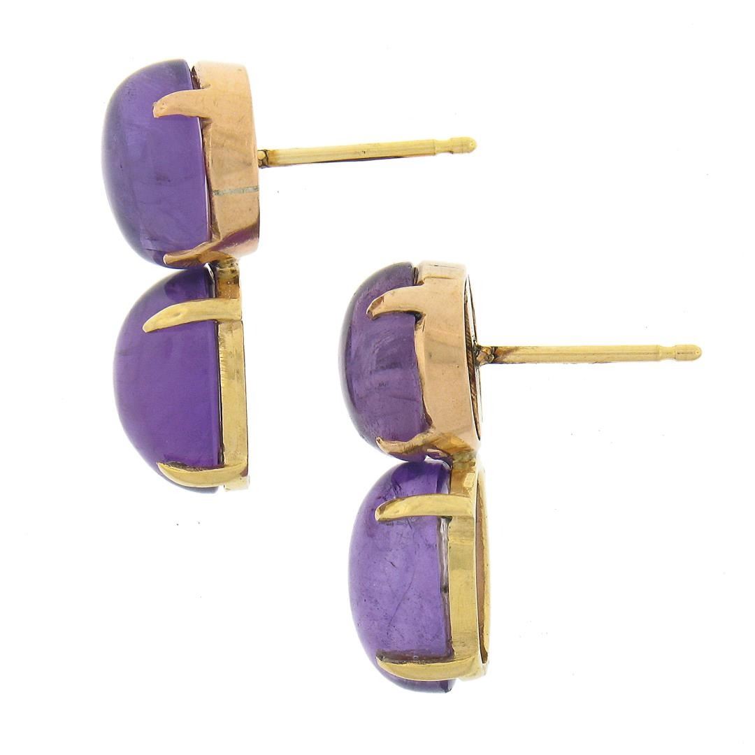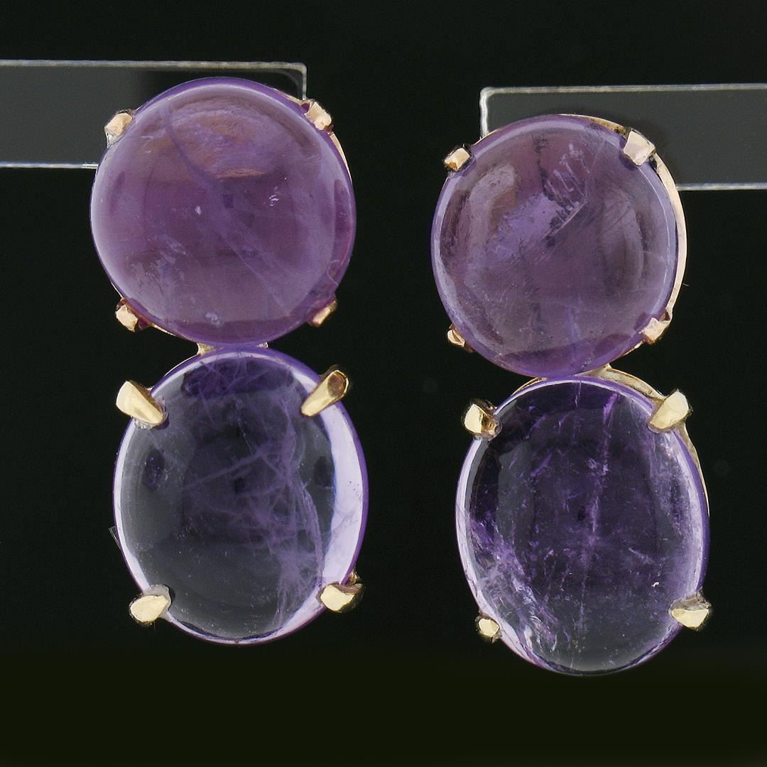 A vintage solid 14k yellow gold earrings, with 2 round & 2 oval cabochon cut natrual amethysts (10.5mm & 11.5x10mm). The earrings measure approximately 22.6x10.6mm and weigh a total of 6.97 grams.