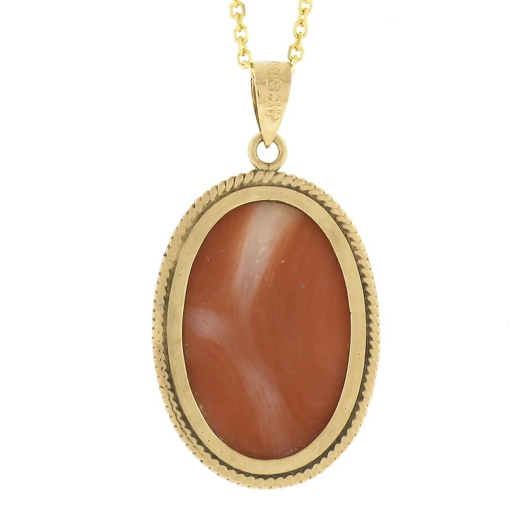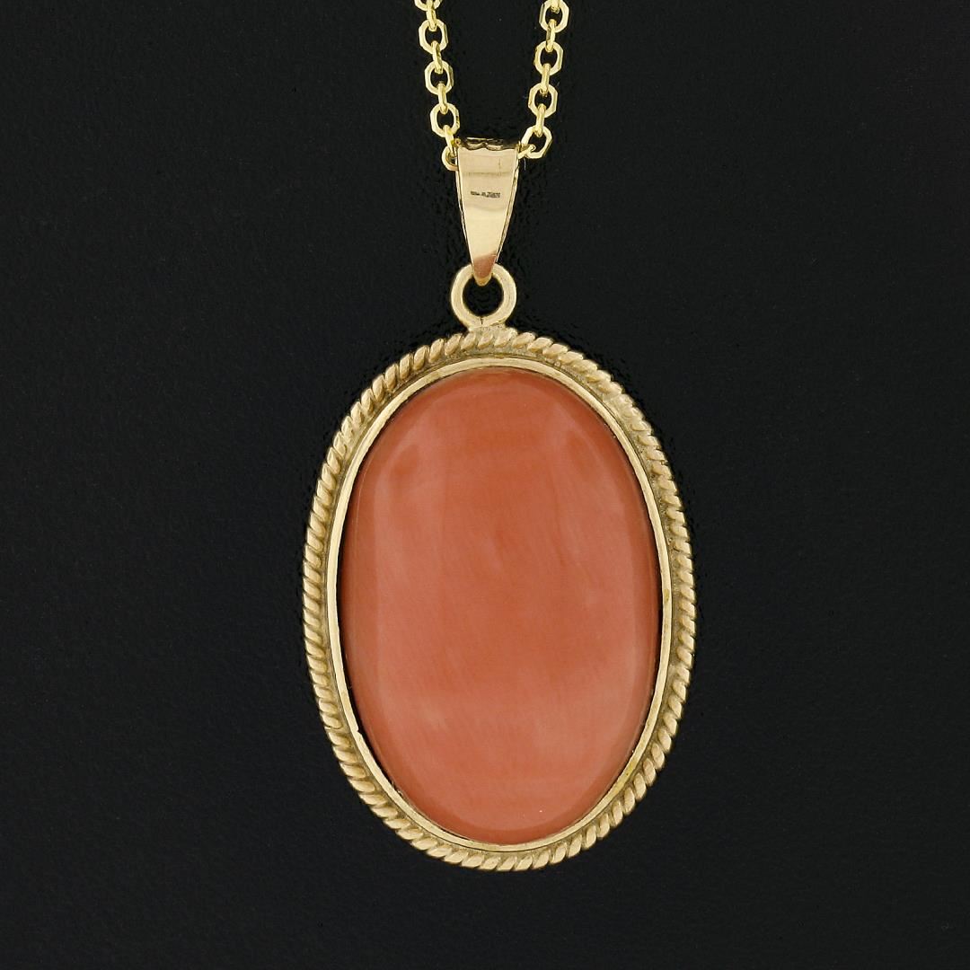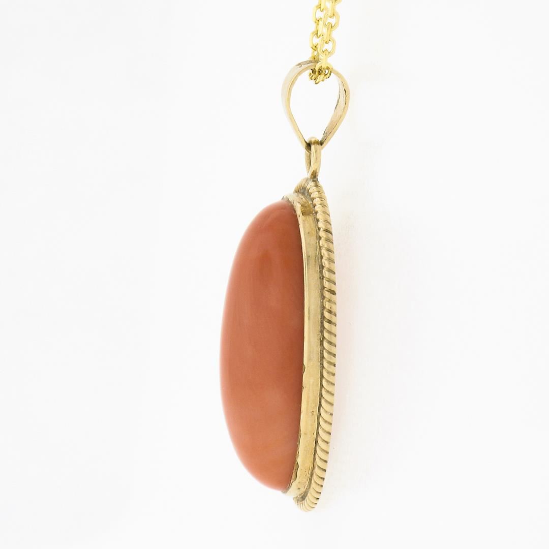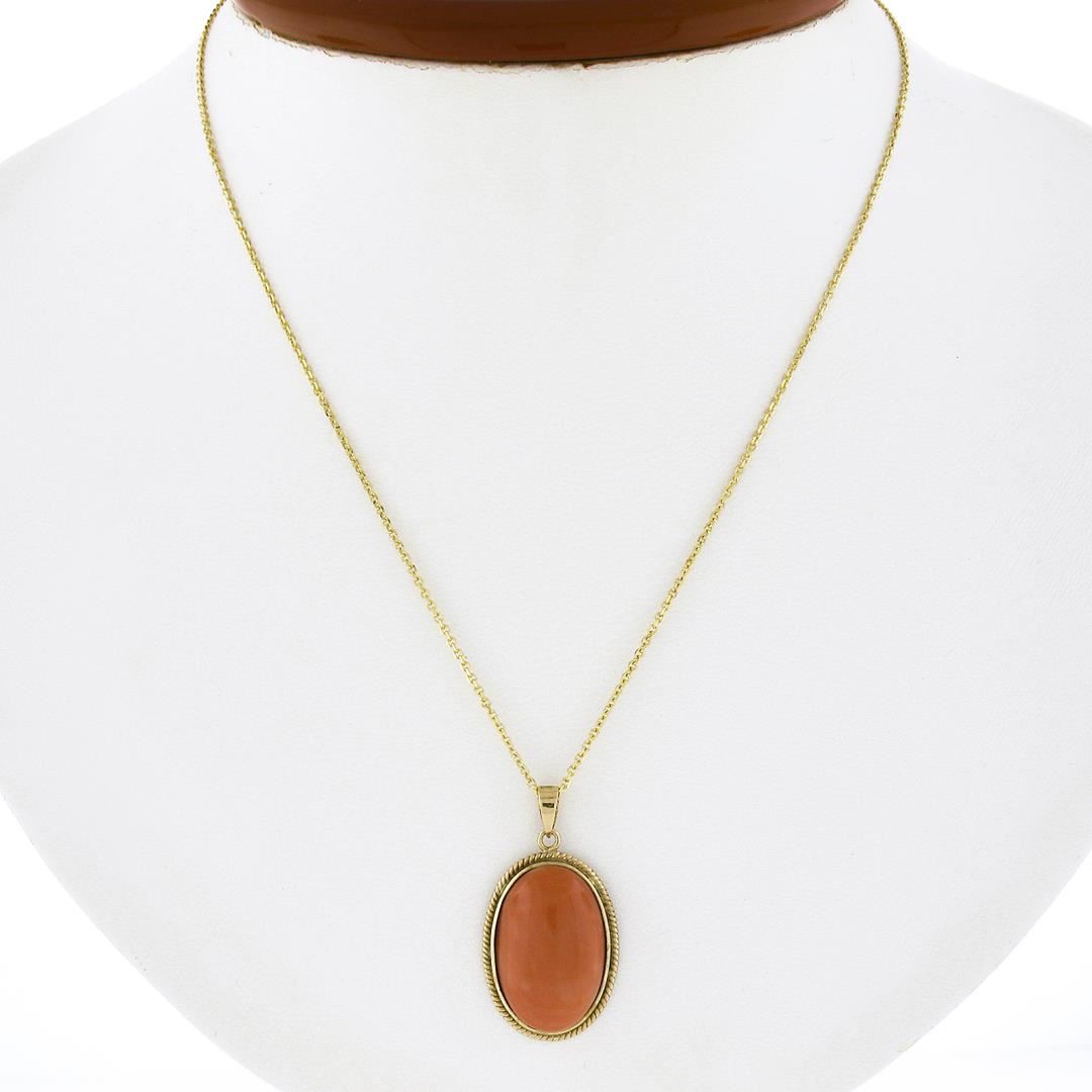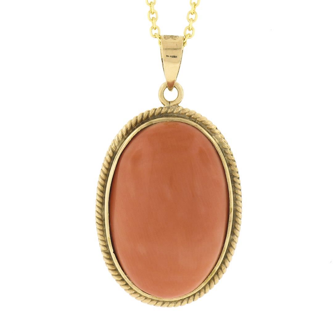 A vintage solid 14k yellow gold pendant necklace, with 1 oval cabochon cut natural coral (18.5x12.2mm). Adjustable 16 or 18 inch cable link chain, 4.79 grams total weight, pendant measures 28.3x15.3mm.