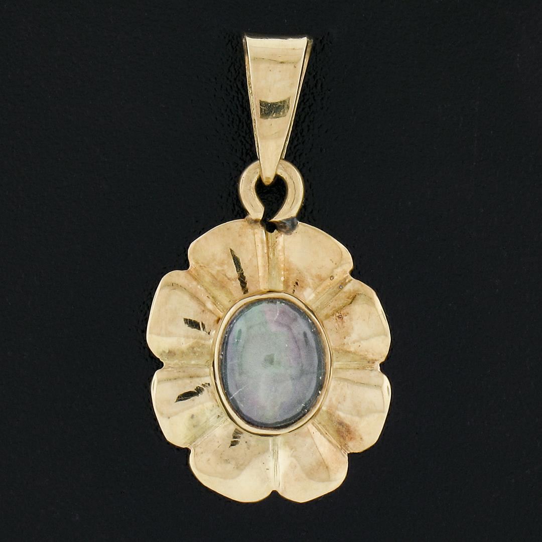 Vintage 14k Gold Oval Cabochon Bezel Set Jelly Opal Scalloped Pendant Charm
