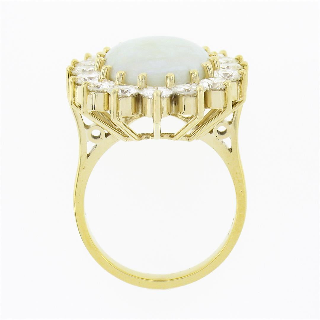 A solid 14k yellow gold ring, with 1 oval cabochon cut natural opal (18x12.45mm), surrounded with a halo of 16 round brilliant cut natural diamonds (G/H - VS1-SI1 ; 4.0ctw). The ring is size 7.0, weighs a total of 8.72 grams, and measures 26.70mm wide.