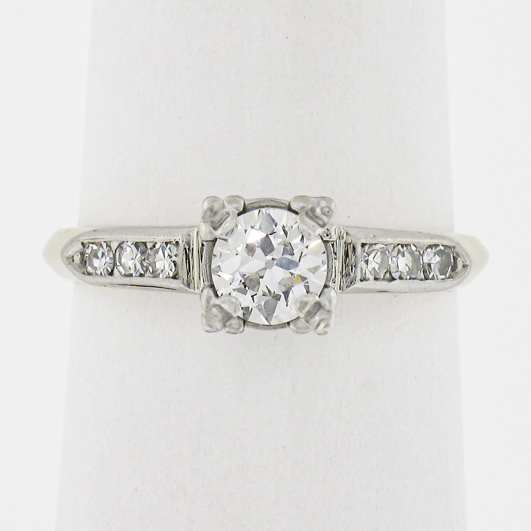 A vintage soldi 14k yellow gold & palladium engagement ring, with 1 old european cut natural diamond (G/H - VS2 ; 0.44ct ), and 6 old single cut natural diamonds (G - VS1/VS2 ; 0.10ctw). The ring is size 6.0, weighs a total of 2.31 grams, and measures 5.7mm wide.