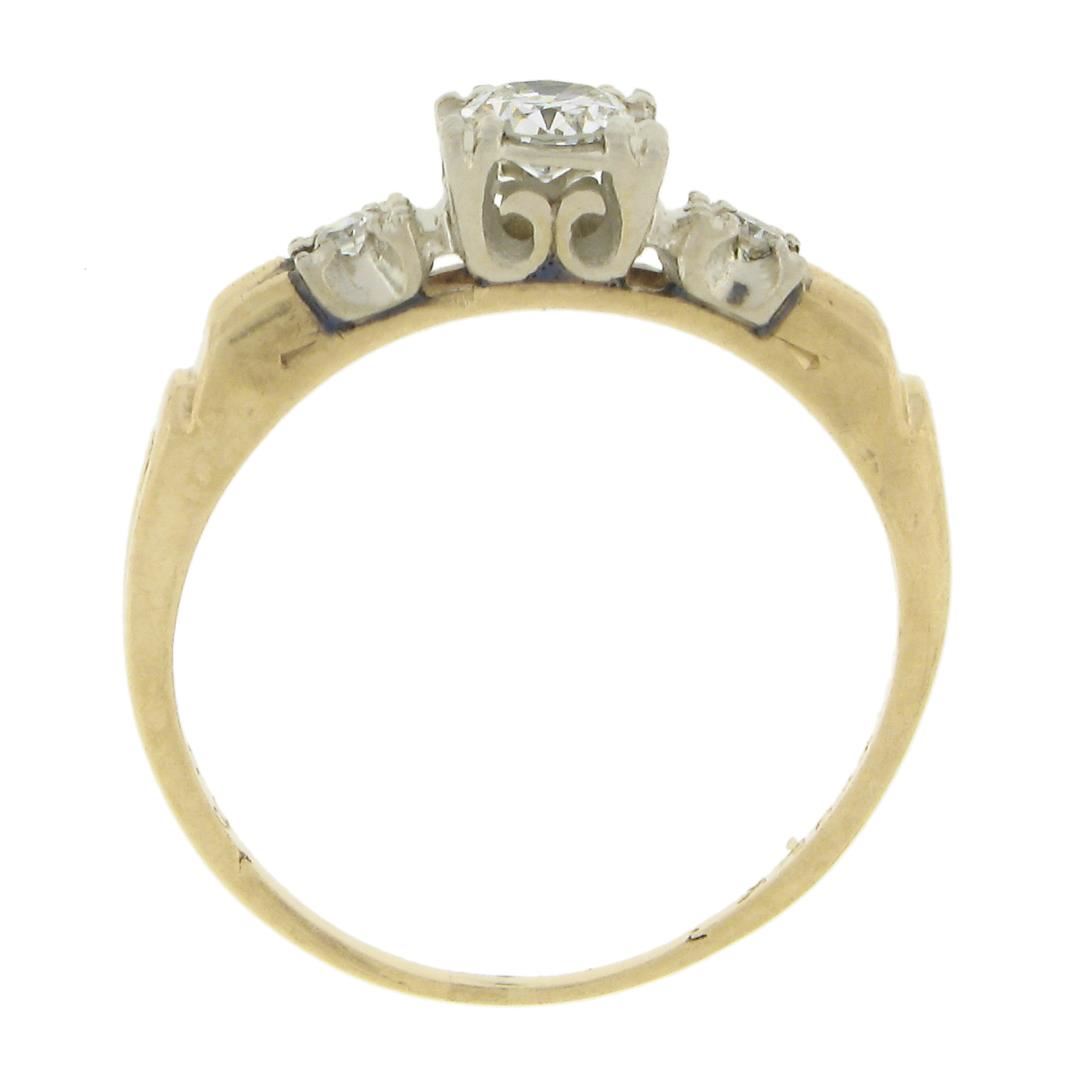 A vintage solid 14k yellow & white gold solitaire engagement ring, with 1 old european cut natural diamond (H - VS2 ; 0.26ct ), & 2 old single cut natural diamonds (G/H - VS2/SI1 ; 0.01ctw). . The ring is size 6.5, weighs a total of 2.23 grams, and measures 5mm wide.
