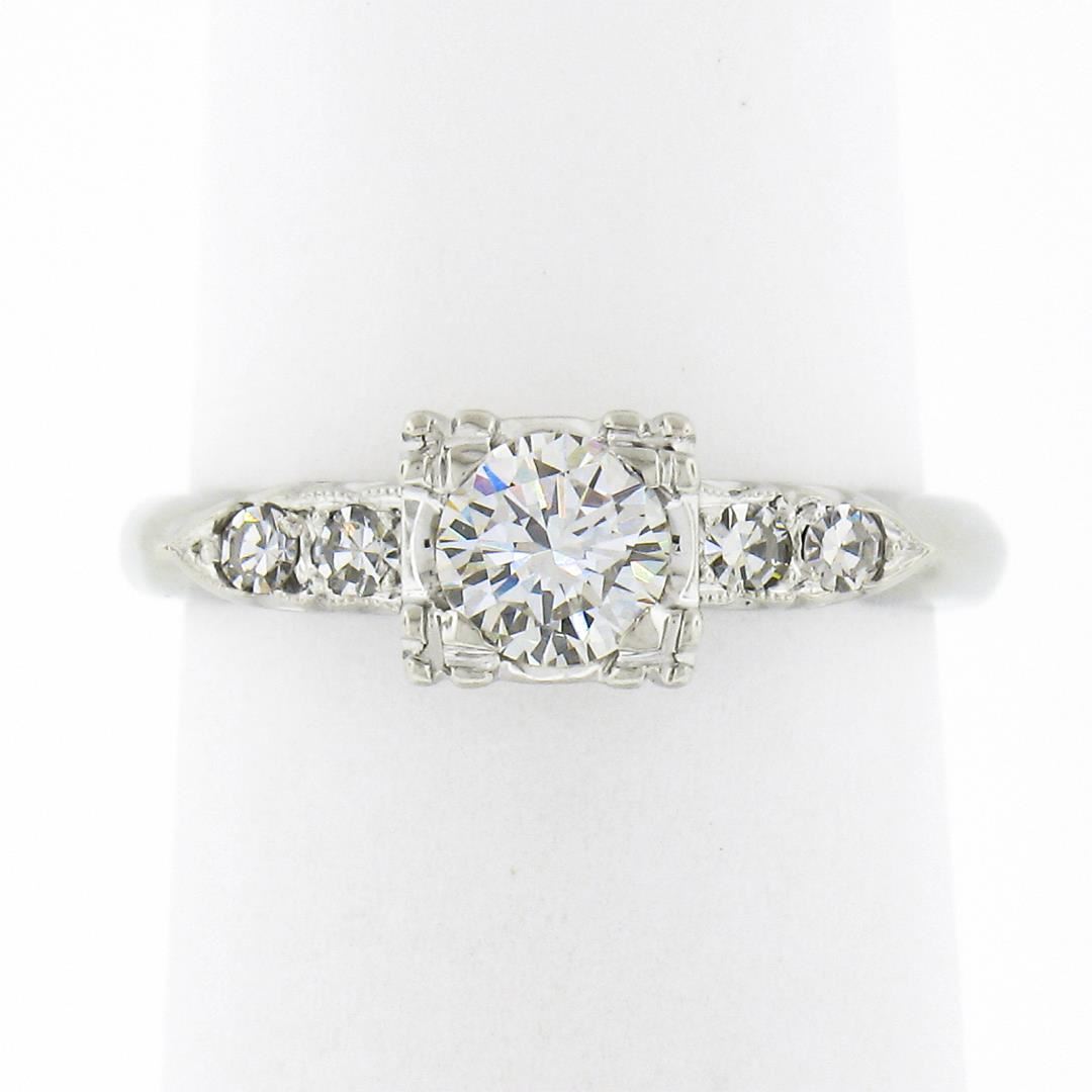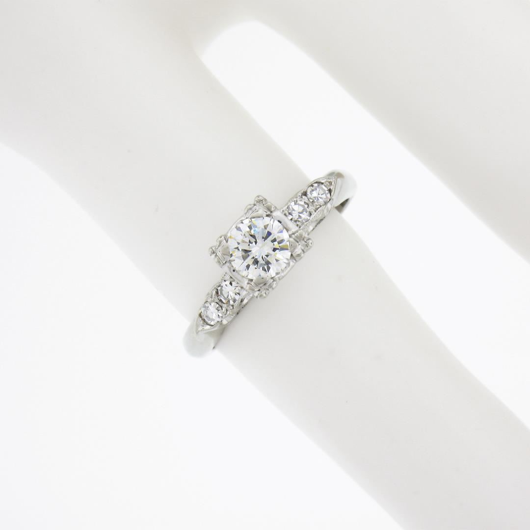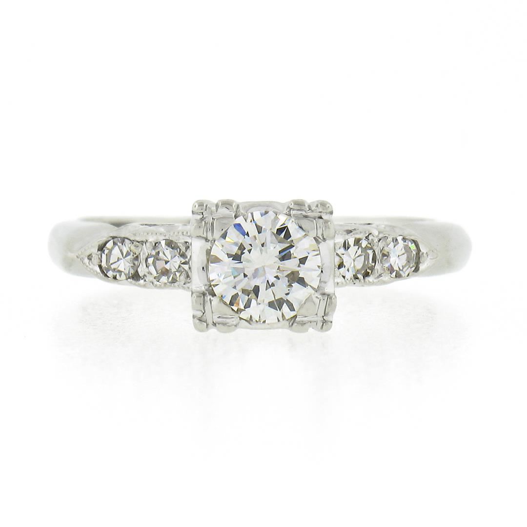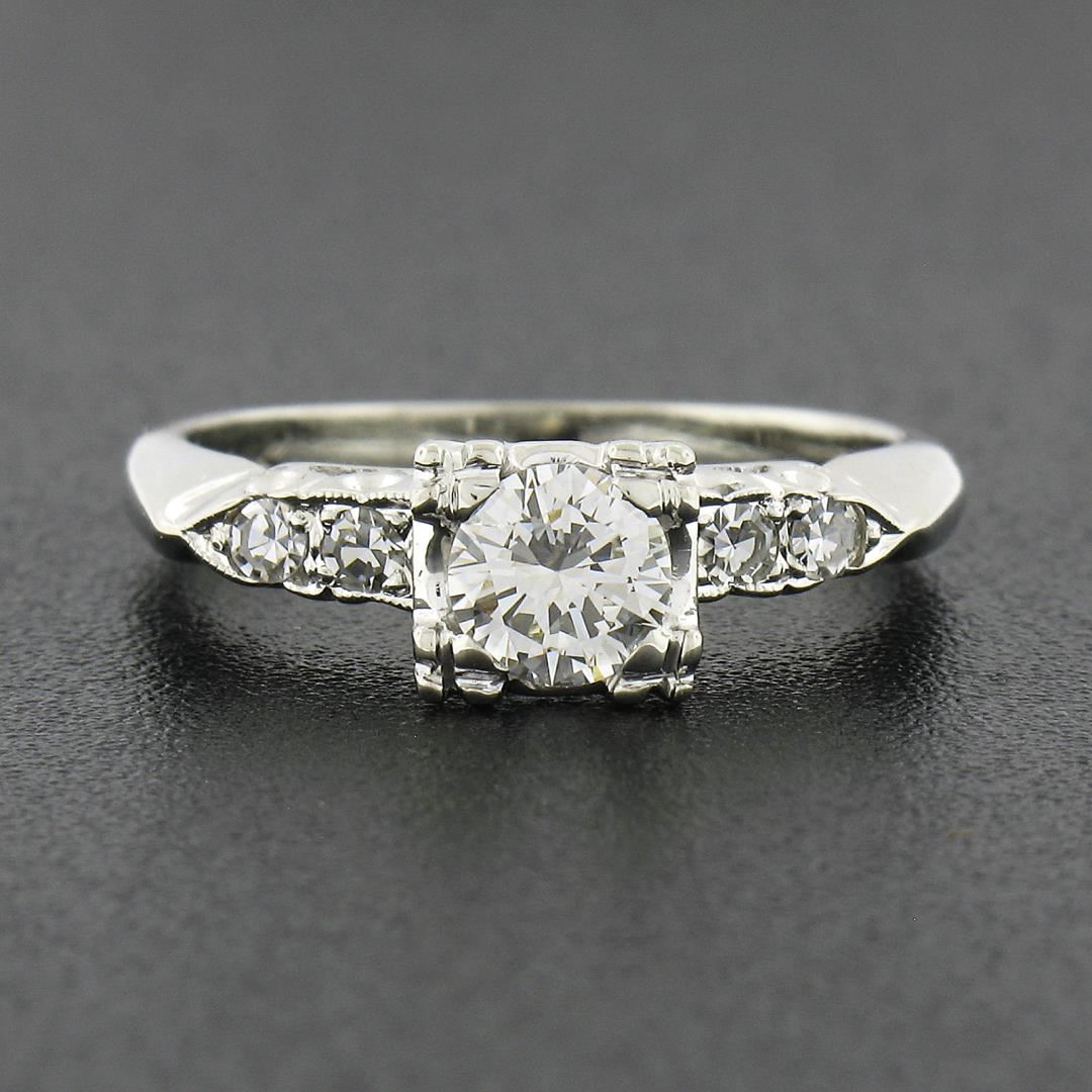 A vintage solid 14k white gold engagement ring, with 1 round brilliant cut natural diamond (G - VS1 ; 0.36ct), accented with 4 old single cut natural diamonds ( F/G - VS1/VS2 ; 0.10ctw). The ring is size 4.0, weighs a total of 2.28 grams, and measures 5.4mm wide.